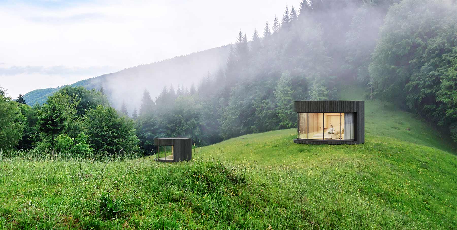 „LUMIPOD is minimal, like the original cell. This prefabricated housing module, a real cocoon of simplicity, settles in the middle of Nature to welcome city dwellers willing to relax away from the concrete jungle.“