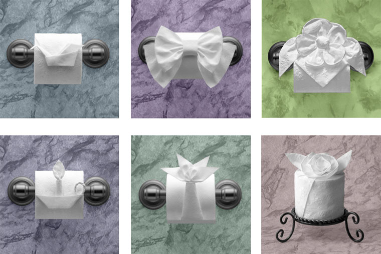 Wer Freunden eine Freude machen möchte, kann das passende Buch Toilet Paper Origami on a Roll: Decorative Folds and Flourishes for Over-the-Top Hospitality käuflich erwerben.