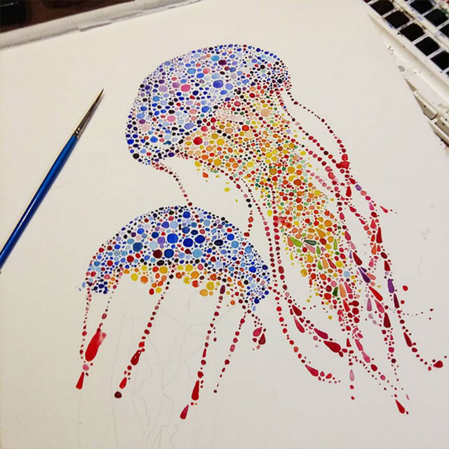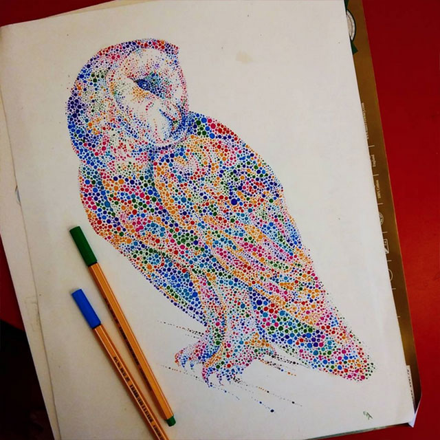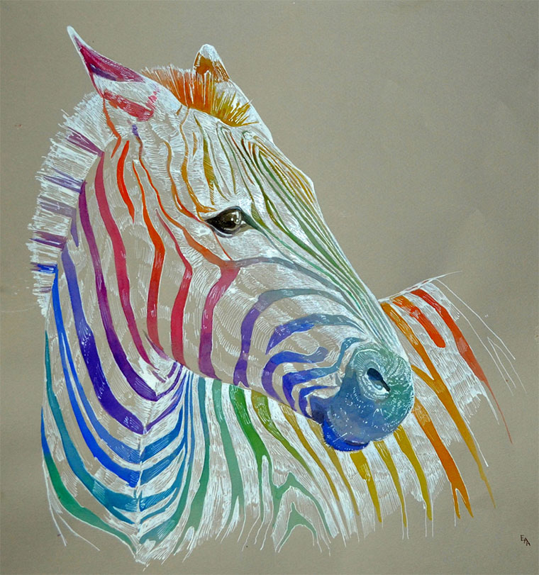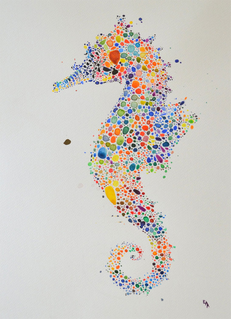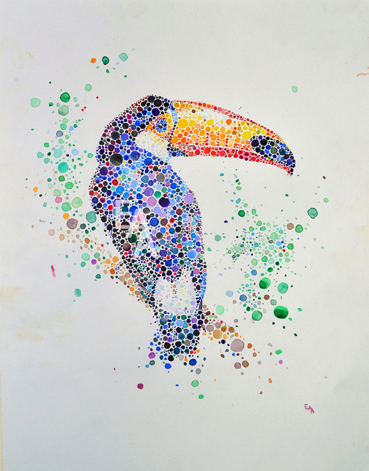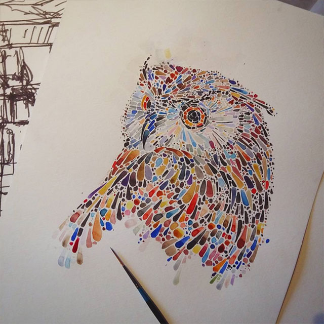 Die Londoner Architektur-Studentin Ana Enshina mag scheinbar Tiere. Und Farben. Mit Wasserfarbe zaubert sie mit vermeintlich leichten Mitteln tolle und farbenfrohe Tierportraits auf Papier. Ein riesiger Pinsel-Duktus in Mosaik-Manier aufgetragen und stets ein bisschen anders, so dass auch zwischen den Motiven Abwechslung herrscht. Das dürfte deutlich länger dauern als man auf den ersten Blick annimmt…