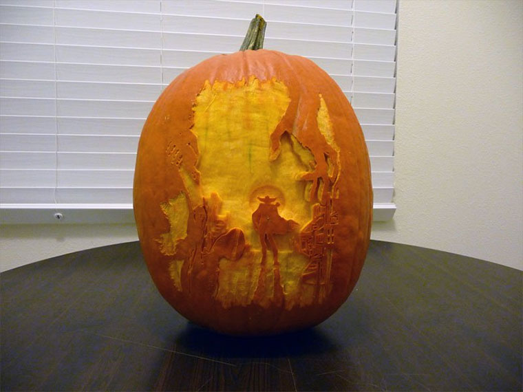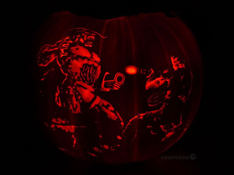 Auge, Auge, Nase, Mund. Das Schnitzen von Kürbissen zu Halloween ist oft so originell wie ein Bettlaken als Geister-Verkleidung. Erfüllt seinen Zweck, mehr auch nicht. ceemdee macht das deutlich ausgefeilter – im wahrsten Sinne des Wortes. Vielschichtig, überlegt und detailreich. Fertig sind die tollen Popkultur-Motive, leuchtend im hellen Orangeton. Besonders interessant finde ich dabei den Vergleich zwischen unbeleuchteten und beleuchteten Kürbissen.