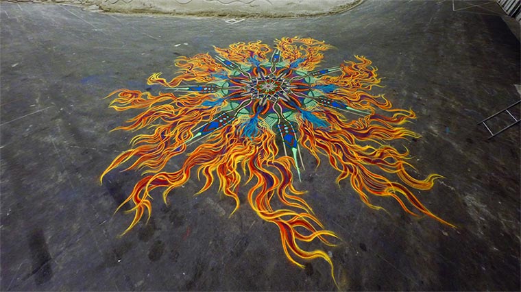 Das Doe Museum im niederländischen Zuidlaren hat den Künstler Joe Mangrum damit beauftragt, insgesamt acht Sandmotive auf den Boden zu malen. Die spontan entstandenen und farbenfrohen Muster wurden in ihrer Entstehung teilweise gefilmt, so dass wir sehen können, wie Schritt für Schritt das spätere Kunstwerk entsteht. Elf Tage hat Mangrum dafür benötigt, wir brauchen zum Glück nur wenige Minuten zum Anschauen.