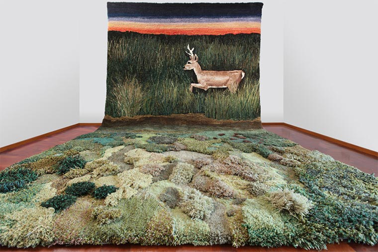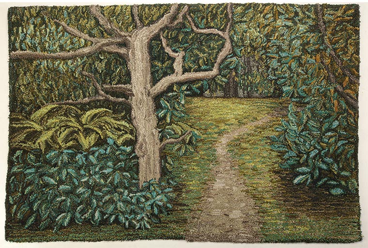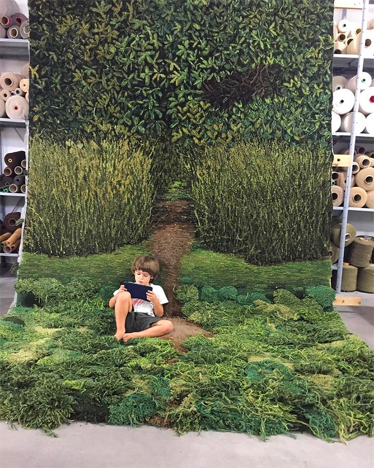 Aus Resten zusammen geklöppelt präsentiert die argentinische Künstlerin wohlfühl-Flächen für die Fußsohlen und/oder dekorative Wald-Blicke für die Wand.