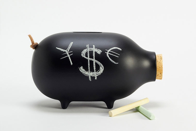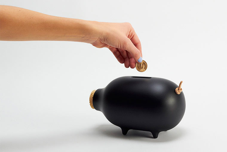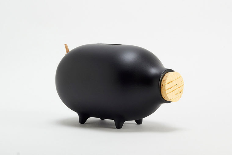„Chalk-it-to-me Piggy Bank, reinvents the classic money-guard and offers room for personalization (or budgeting) on its black ceramic, chalk-able surface.“