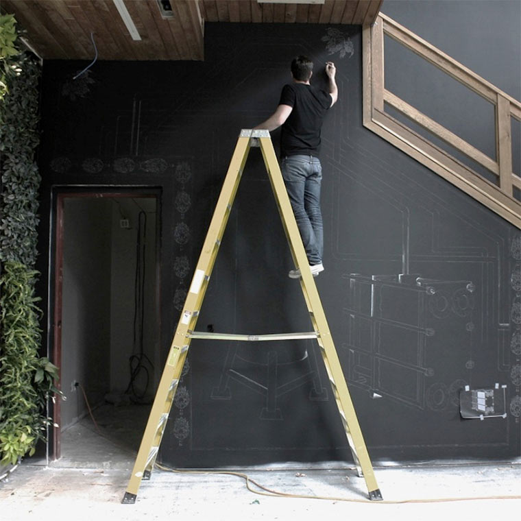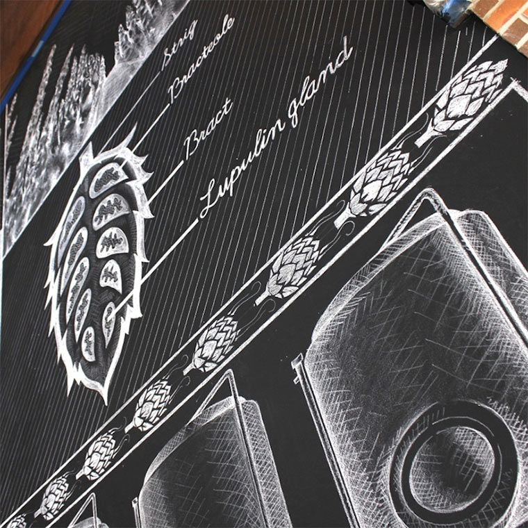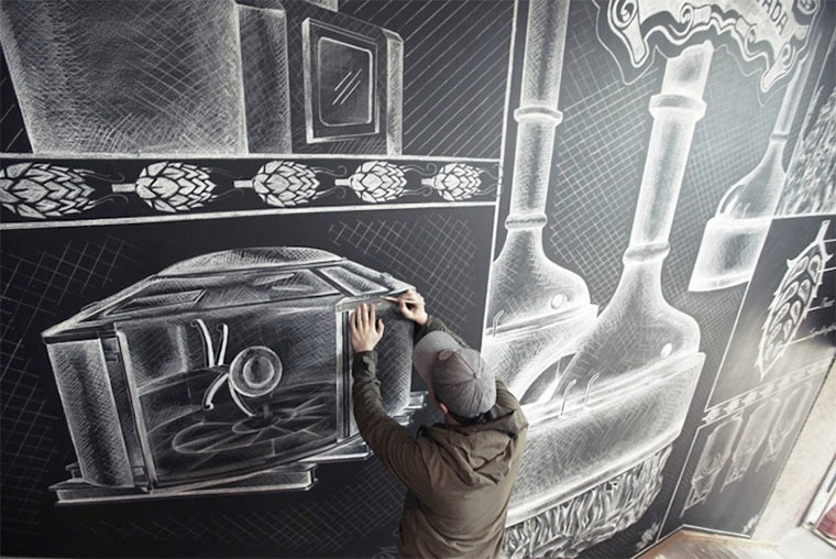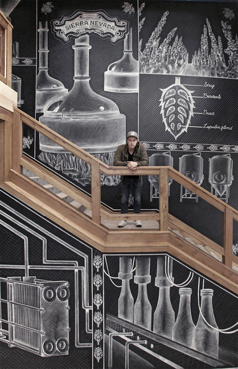 Es gibt viele coole Sachen mit Kreide, aber das hier ist wortwörtlich gigantisch! Der in Toronto lebende Designer Ben Johnston hat für die Sierra Nevada-Brauerei ein gigantisches Kreide-Mural entworfen und auf die Schiefer-Wände gezaubert. Knapp 150 Quadratmeter ist seine Illustration von Brauerei-Containern und Design-Elementen groß und satte drei Wochen hat die Entstehung gedauert. Beeindruckend ist dabei die Sauberkeit der Darstellungen, auch in den sehr feinteiligen Passagen. Bleibt zu hoffen, dass es möglichst lange hält!