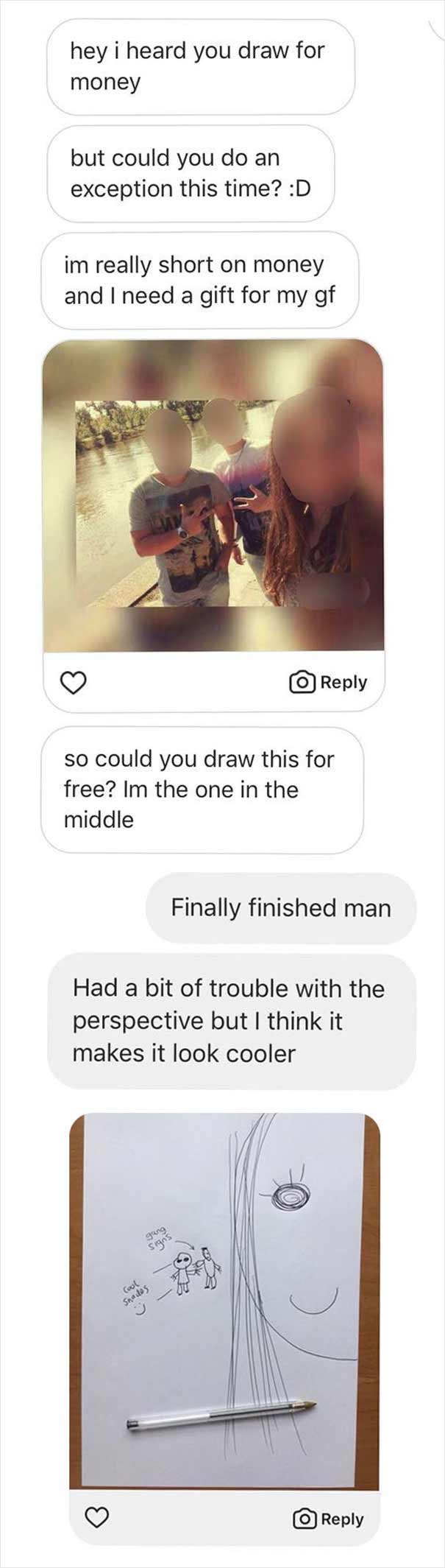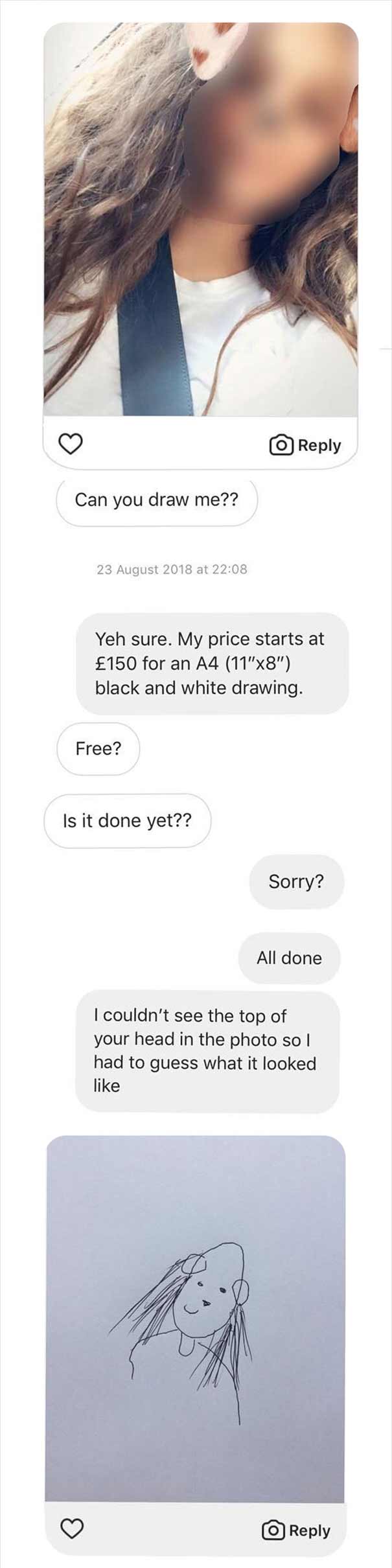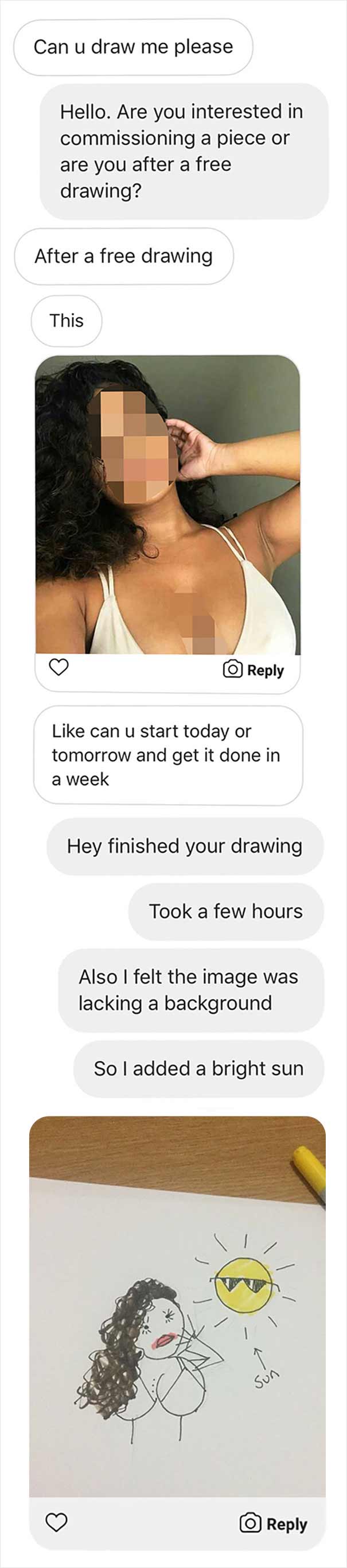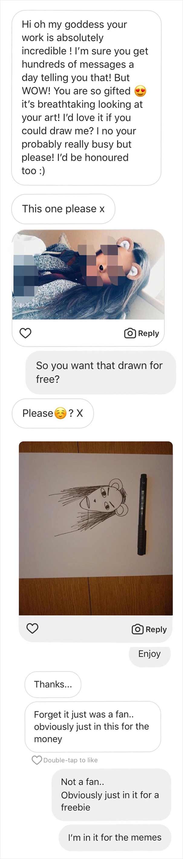 „It can be a bit irritating. I take it as a compliment and most people are a bit unaware of how much time can go into a piece of art. I thought a silly doodle may get this point across and hopefully make people laugh. Art isn’t really seen as a job/career but more of a hobby which you enjoy, so people assume you would be happy to do it for a little bit of ‘exposure.‘ I wish I could do drawings for free. It is something I have done for giveaways to my followers online or for charity. Sadly, I have to fund my expensive pencil habit.“