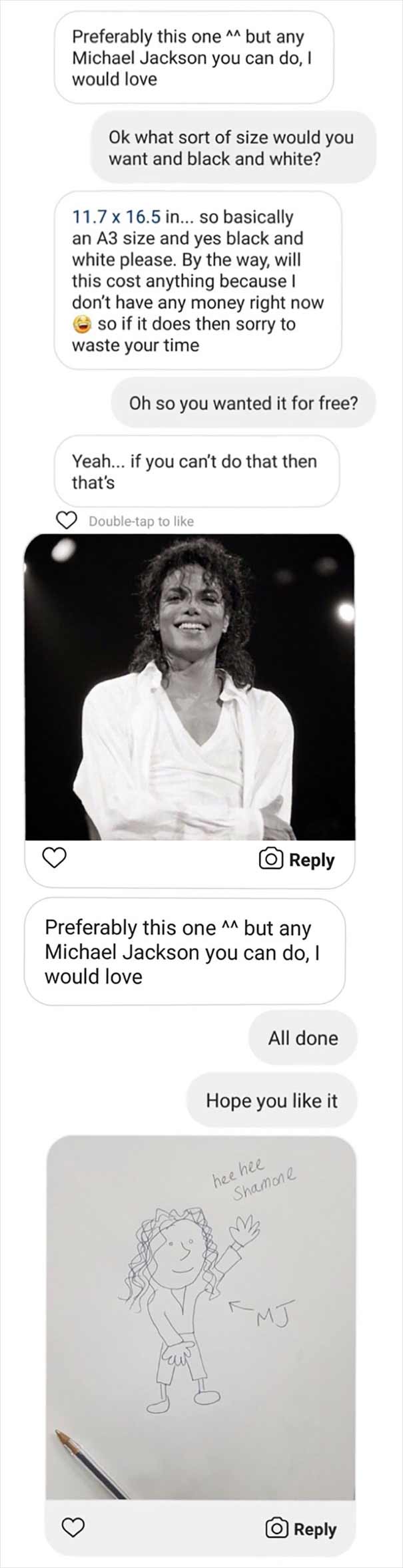 Der britische Künstler Jon Arton bekommt wöchentlich mehrere solcher Anfragen, da er öffentlich angibt, Auftragsarbeiten zu fertigen. Dürfte der Großteil nach der ersten Preisinfo belehrt sein, bleiben andere hartnäckig und fordern dreist ein, was sie haben wollen – also liefert Jon. Mit kleinen Kritzeleien, die ein Drittklässler hätte machen können. Aber wenn er dann irgendwann zu Weltruhm gekommen ist, sind die ein Vermögen wert!