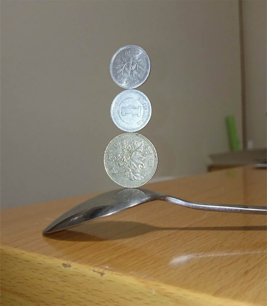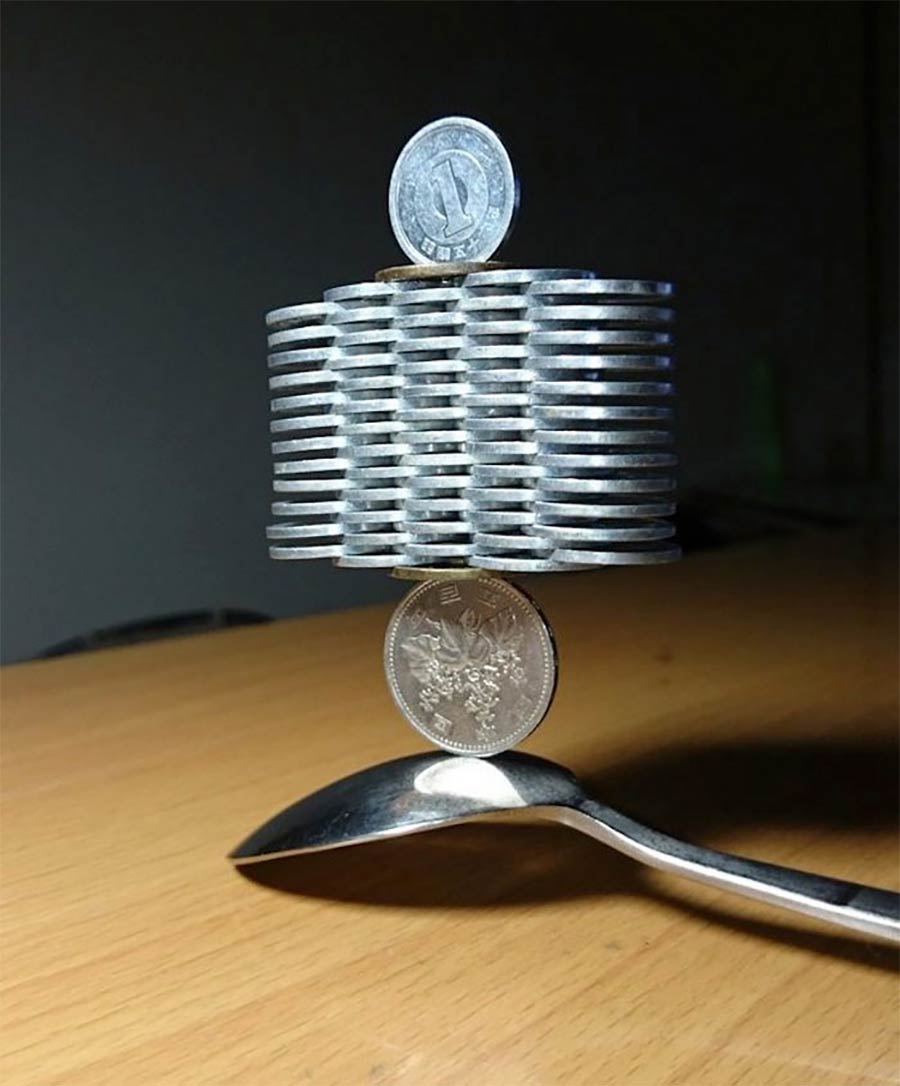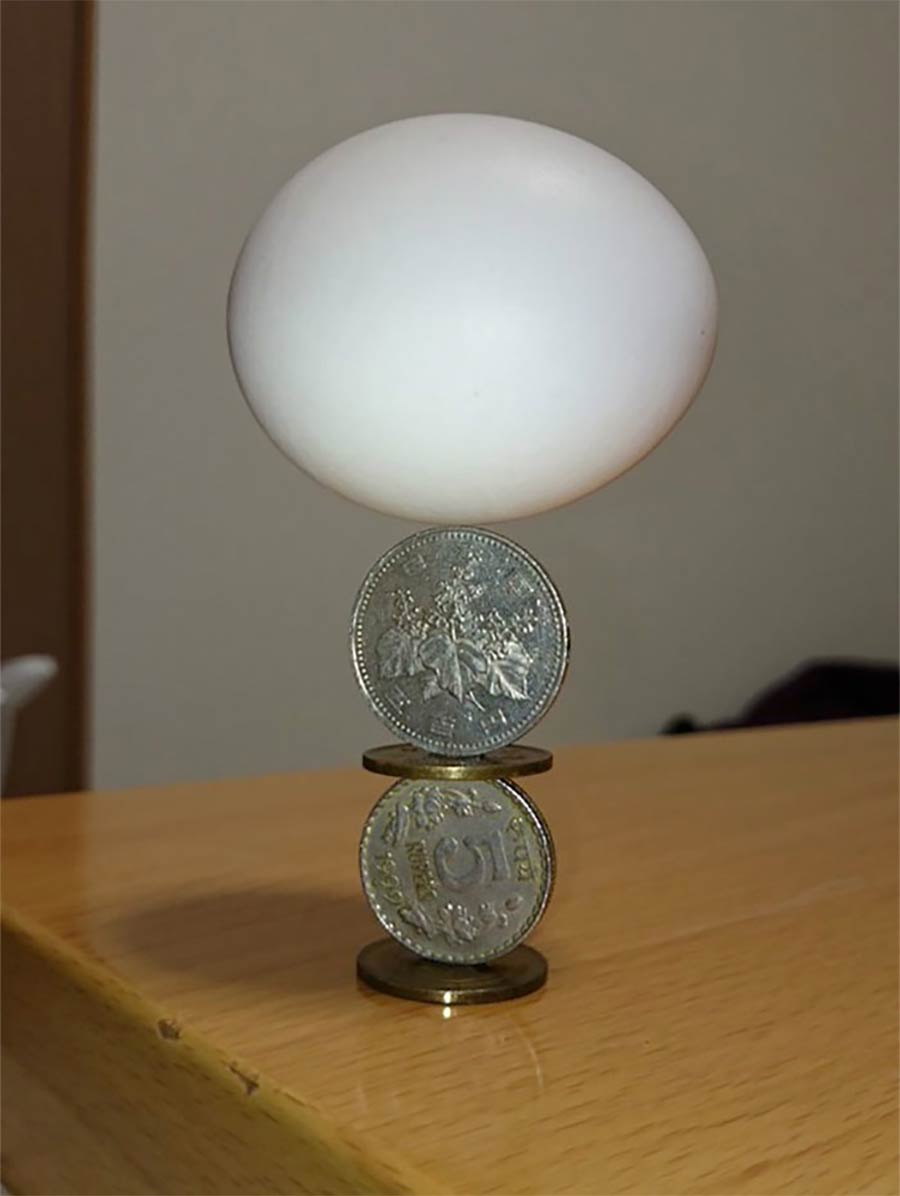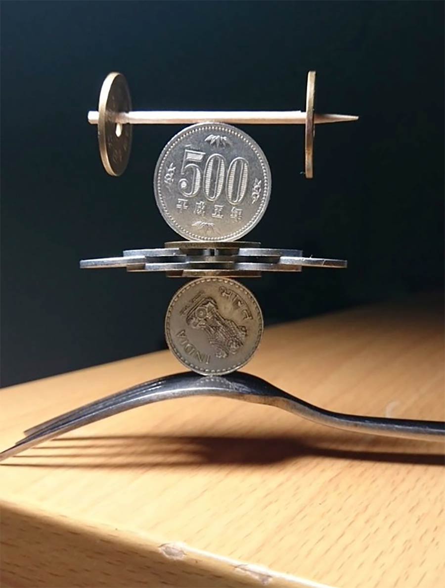 Manch einer hat bereits so seine Probleme damit, eine Münze auf seine Kante zu stellen. Mehrere übereinander stapeln? Ui-uiuiuiui! Der Japaner Thumb Tani dürfte das im Schlaf können, betrachtet man seine ungemein komplexen Geldgebilde. Ich frage mich ja, wie viele Anläufe er da jeweils für gebraucht hat. Jedenfalls baut er beeindruckende Türme und Balance-Akte mit Münzen, und wenn es mit denen zu einfach wird, baut er einfach Schwierigkeitsgrad-Erschwerer ein. Zum Beispiel einfach mal ein Ei…