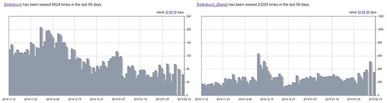 Investigative Recherchen haben ergeben, dass eure Wikipedia-Seite in den letzten 30 Tagen 8.161 Mal aufgerufen wurde – mehr als das Vierfache des Eintrags zum Büchertyp „Bilderbuch“, der nur 1.992 Aufrufe hatte. Beim Anblick der Tendenz der letzten 90 Tage zeigt sich deutlich, dass die Entwicklung gegenläufig ist. Wenige Wochen nach Album-Release dürfte der klassische Begriff aus Gründen der Irrelevanz geschlossen werden. Ist es euer Ziel, den eigentlich geläufigen Begriff komplett für euch einzunehmen, so dass kommende Generationen ihn gar nicht mehr als „Buch“ kennen?