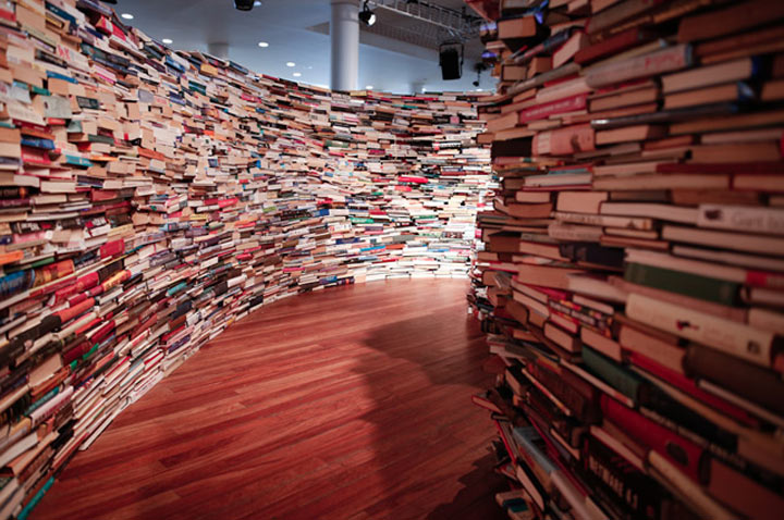 „A vast labyrinth of 250,000 books, entitled aMAZEme, was installed on The Clore Ballroom in the Royal Festival Hall between 31 July – 25 August, as part of Southbank Centre’s Festival of the World with MasterCard.“