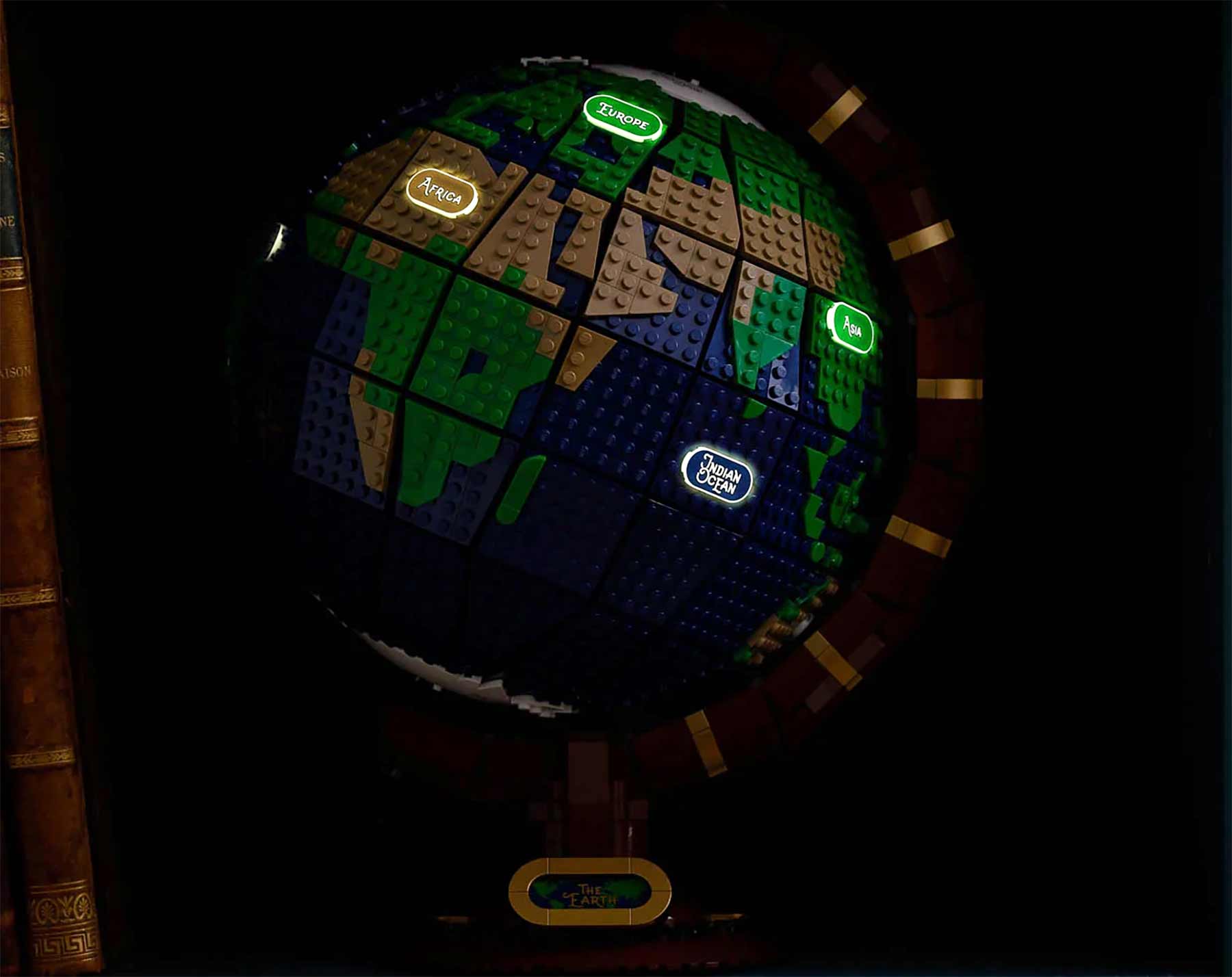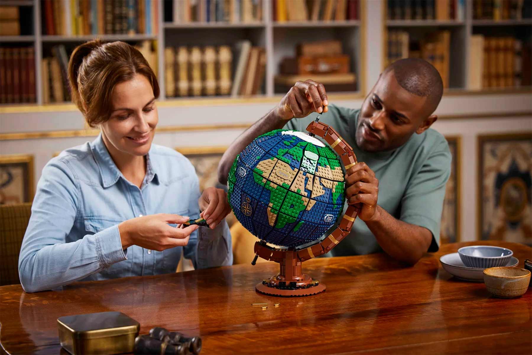 „Wohin soll die Reise heute gehen? Baue den Globus (21332) und träume von deinem nächsten Reiseziel. Dieses spektakuläre Ausstellungsstück wurde von einem Fandesigner entworfen und vom LEGO® Ideas Team zum Leben erweckt. Mithilfe von LEGO Technic Elementen lässt sich die Erdrotation darstellen, und im Dunkeln leuchtende Steinchen bezeichnen die Kontinente und Ozeane. Das Schiff und der Kompass zum Zusammenbauen sowie das Namensschild „The Earth“ vollenden den attraktiven Blickfang fürs Wohnzimmer oder Büro.“