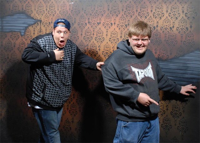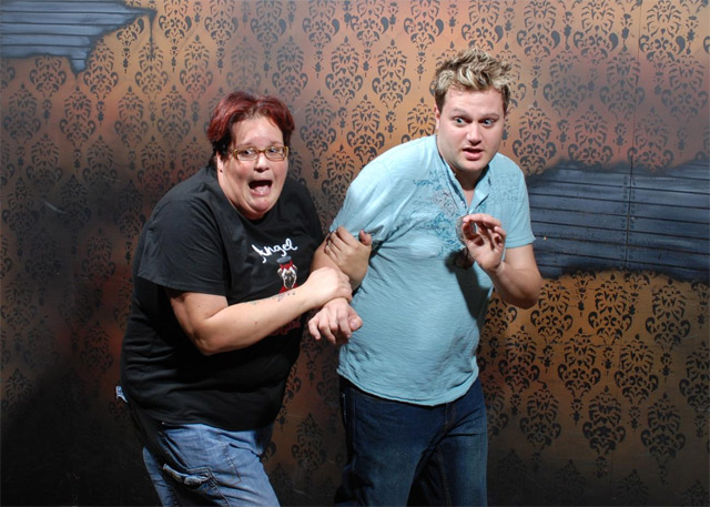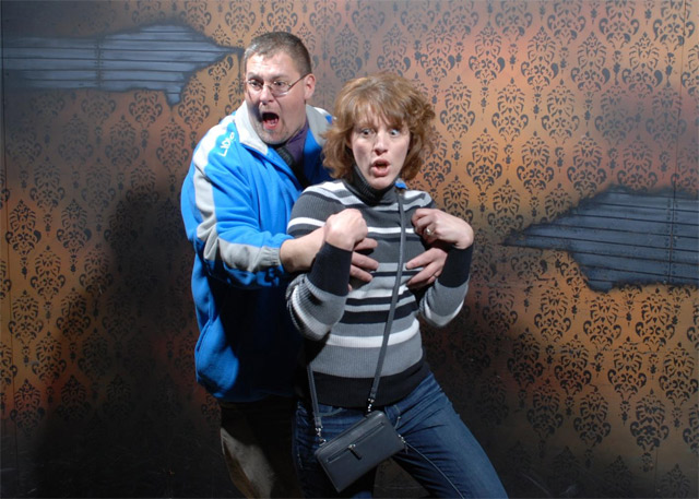 Schon oft und überall gesehen, aber es kann nicht oft genug sein: Die kanadische Grusel-Attraktion Nightmares Fear Factory macht in guter alter Jahrmarkts-Tradition Bilder von ihren Gästen. Selbstverständlich im für diese unpassendsten Augenblick. In einem stockdusteren Raum erscheinen plötzlich die Scheinwerfer eines Autos und es entsteht der Eindruck, dieses beschleunigt auf die Verschreckten zu. *Knips*