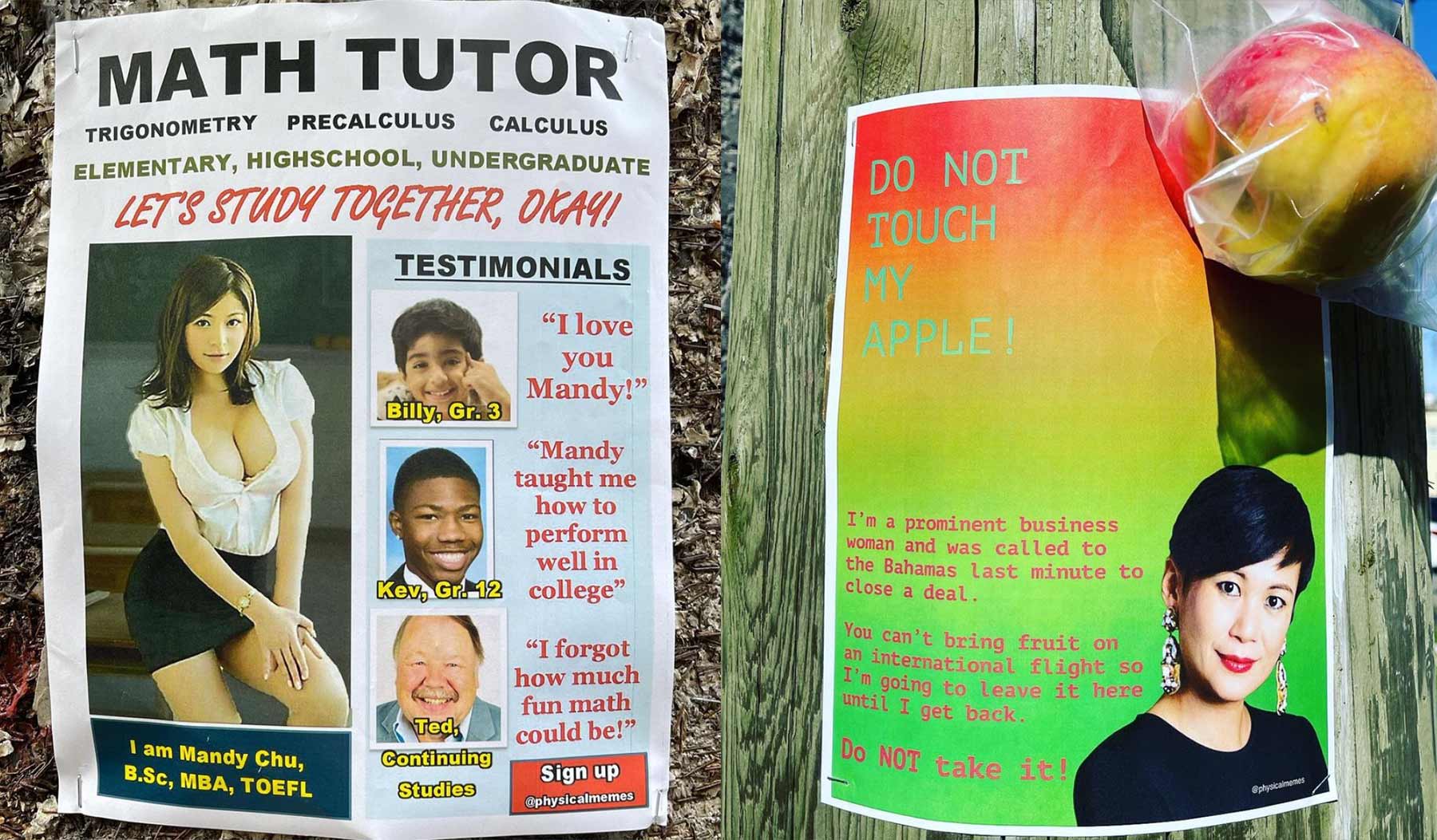 „What we do is provide a kind of comedic, social commentary through the juxtaposition of the ordinary medium of a public flyer with content that highlights, in some way, a recognizable but unvoiced social dysfunction.“