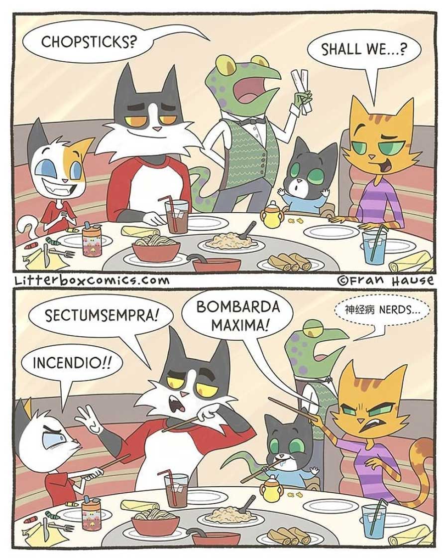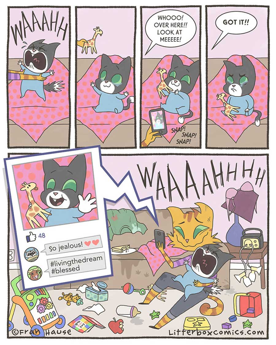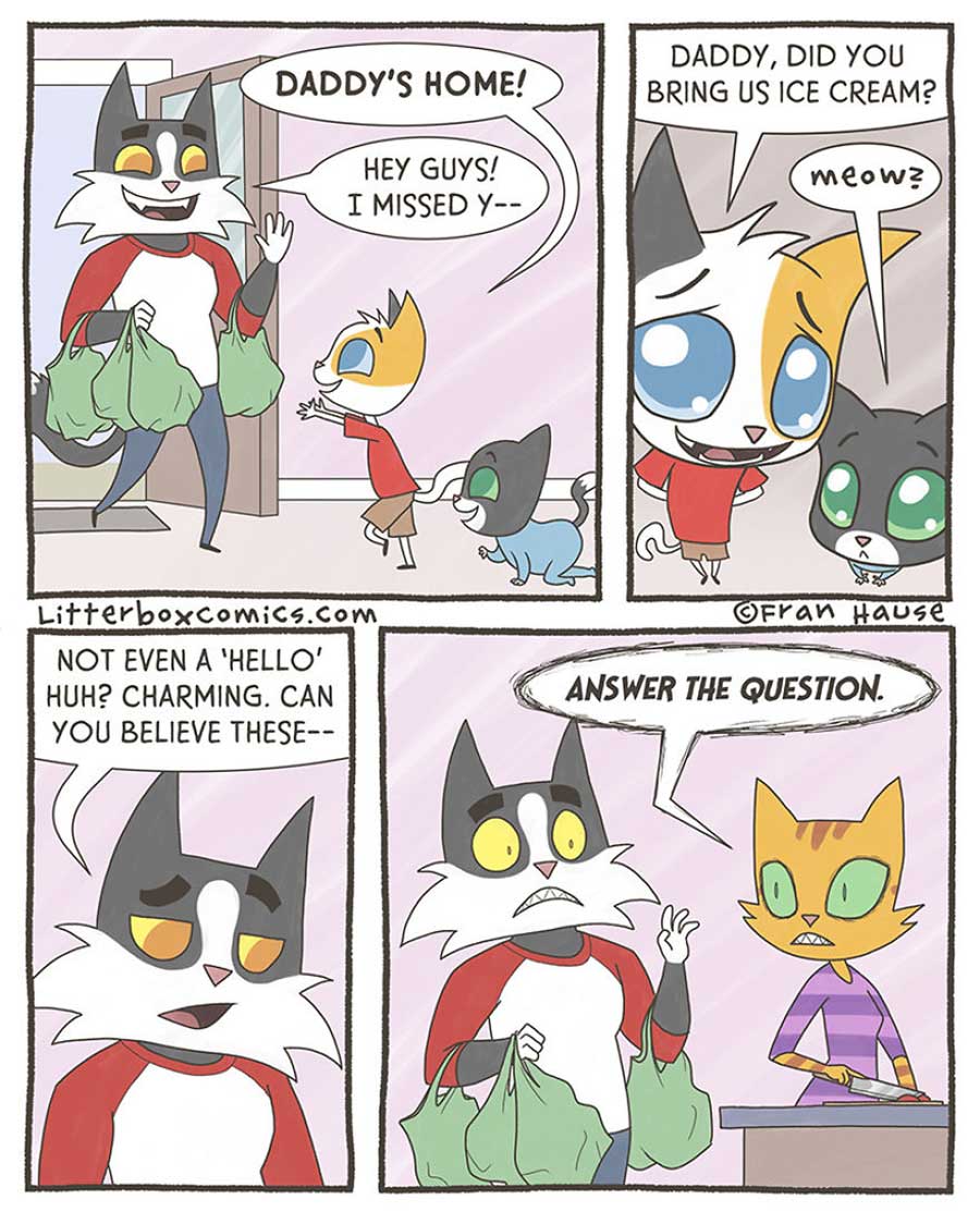 Mittlerweile ist es ja etwas in Mode gekommen, seinen Alltag als Webcomic Artist festzuhalten. Privates, Familiäres, Beziehungstechnisches – halt all die Dinge, mit denen sich viele auf der Welt identifizieren können. Bei Mutter Francesca Hause ist das etwas anders. Nun ja, sie zeigt in ihren Comic Strips auch skurrile bis lustige Momente des Familienleben, aber in ihrer „Litterbox“ gibt es eben nur Katzen.