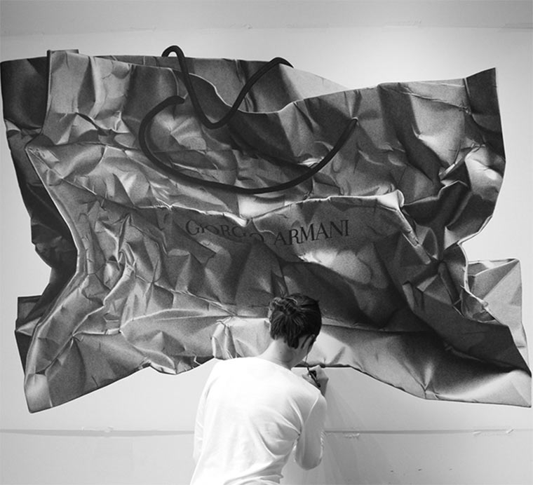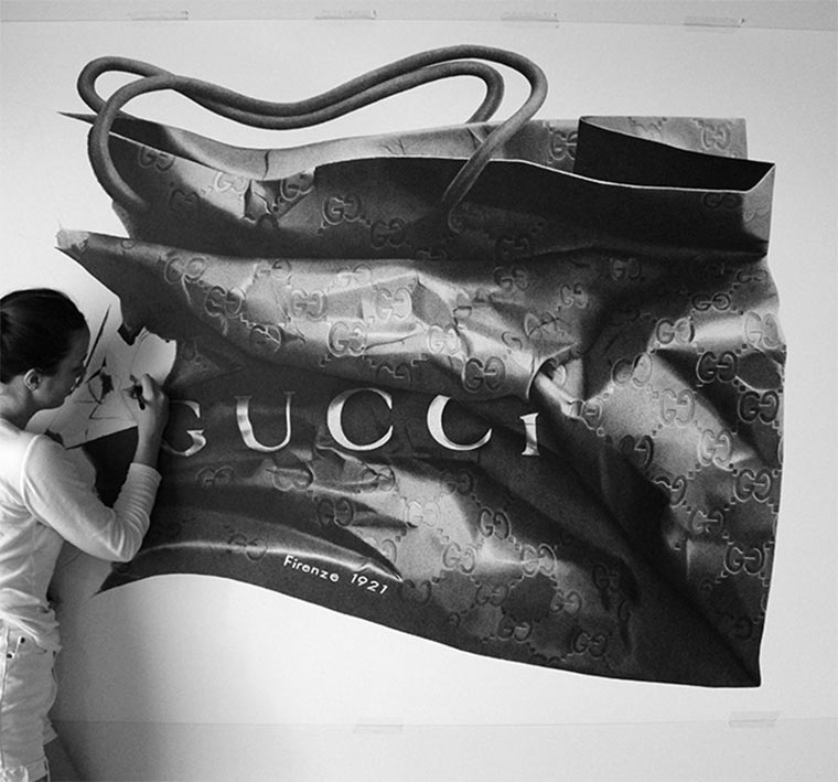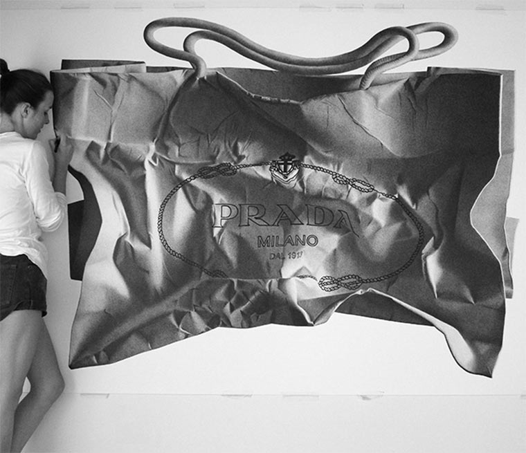 Ende letzten Jahres hatte ich euch die detailgetreuen Luxusobjektzeichnungen von CJ Hendry vorgestellt. Damals ging es um feine Schuhe, teure Handtaschen und einfach überdimensionale und möglichst fotorealistische Darstellungen von Gegenständen. Das macht Hendry zwar noch immer, jetzt hat die Künstlerin aber einen noch skurrileren Ansatz für sich entdeckt: die realitätsgetreue Nachzeichnung von Einkaufstüten, die mit Luxus-Labels versehen sind. Alleine die dürften vermutlich ein kleines Vermögen kosten, die resultierenden Kunstwerke allemal. Ein Grund, die Arbeiten der Australierin nochmals in den Schaukasten Internetweblog zu stellen!
