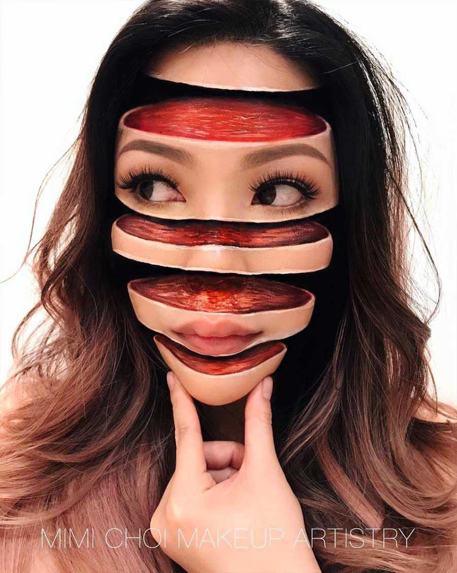 Make-up-Artist Mimi Choi hat ihre Anmal-Lehrstelle aufgegeben, um sich voll und ganz ihrer kreativen Body Art widmen zu können. Die 31-jährige aus Vancouver verziert das Gesicht von ihr und ihren Kunden gerne mit optischen Illusionen, die physische Verletzungen und Kuriositäten auf realistische Art und Weise darstellen. Ist zwar jetzt nichts ultra-Neues, aber dann doch immer wieder nett anzuschauen (s. SFX by David, Sarah Mudle oder Saida Mickeviciute).