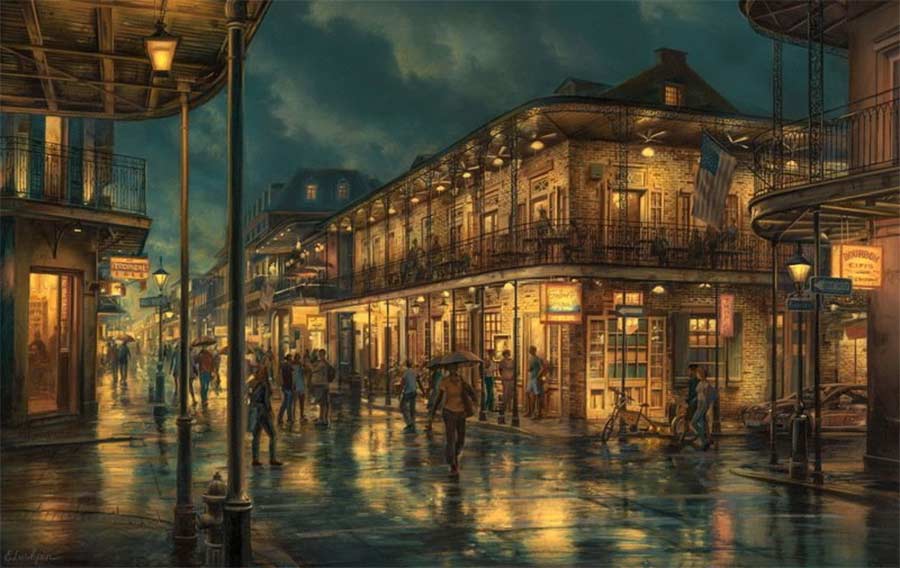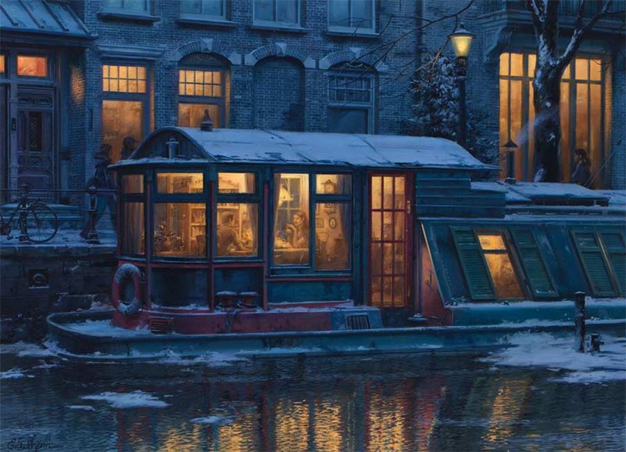Nein, so ganz fotorealistisch muten die Gemälde Evgeny Lushpins nicht an, dafür ist die Farbgebung zu „cartoony“ und die Figuren etwas zu künstlich. Aber neben der Perspektive der Szenerien weiß er vor allem in Sachen Licht- und Texturdarstellung sehr zu überzeugen. Die Bilder bilden halt eine sehr realistische Atmosphäre ab und erinnern so dann doch in gewisser Weise an Fotografien.