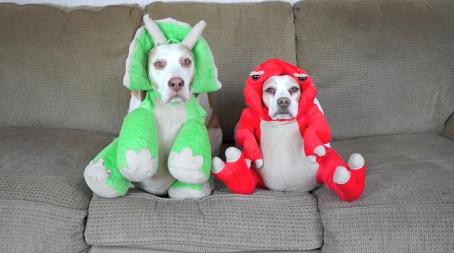 „Watch this cute beagle duo dressed in everything from elephants to penguins, to peas and carrots, and even Star Wars characters.“
