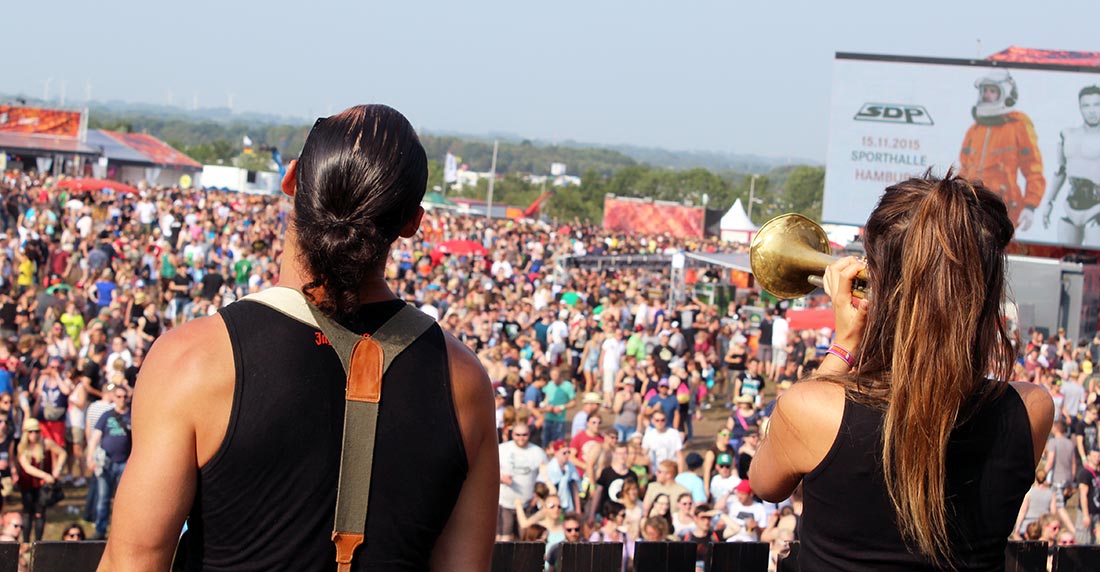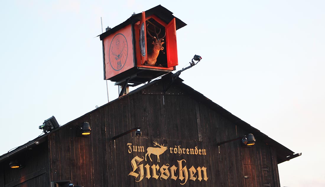 Ich habe das vorher etwas belächelt – „Jaja, dann röhrt der Hirsch ein bisschen und die spielen da Mucke ab – schön für die, die im Häuschen sind“. Aber ne – die Leute gehen tatsächlich ab! Das ist durchaus smart gemacht, denn zwischen den Acts, die zeitversetzt auf den beiden großen Bühnen gespielt haben, wandeln einige Festivalbesucher orientierungs- und ahnungslos umher und werden vom plötzlichen Geröhre tatsächlich angezogen. Der hoch- und ausfahrende Hirsch hat aber auch was für sich!