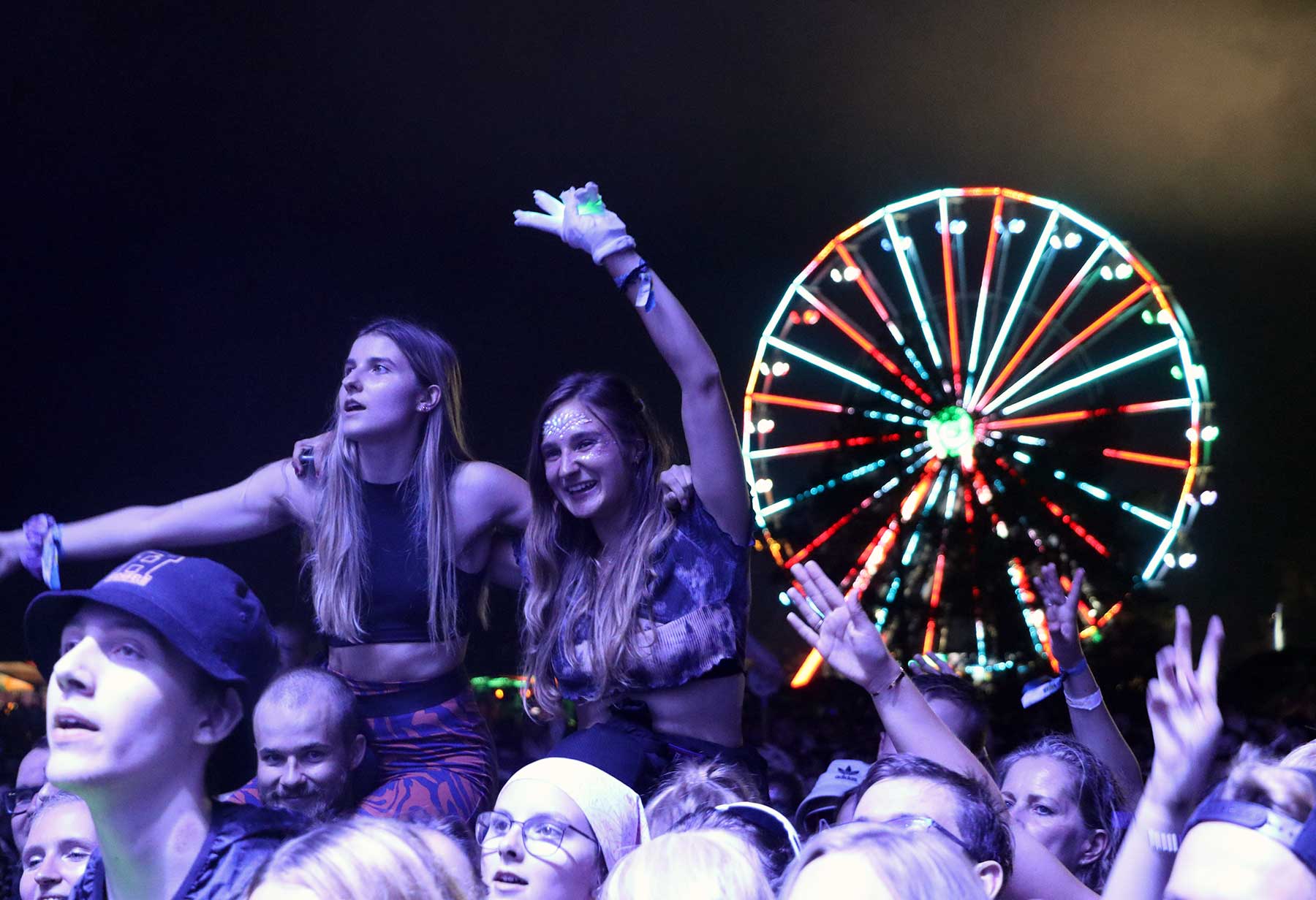 Ansonsten hat der Auftritt Foto-technisch jetzt nicht so viel hergegeben, was sicherlich auch dazu geführt hat, dass sich einige Fotograf:innen mit der Zeit eher dem Publikum denn der Band gewidmet hat. Dort kam dann auch das schöne Motiv mit dem Riesenrad im Hintergrund zustande.