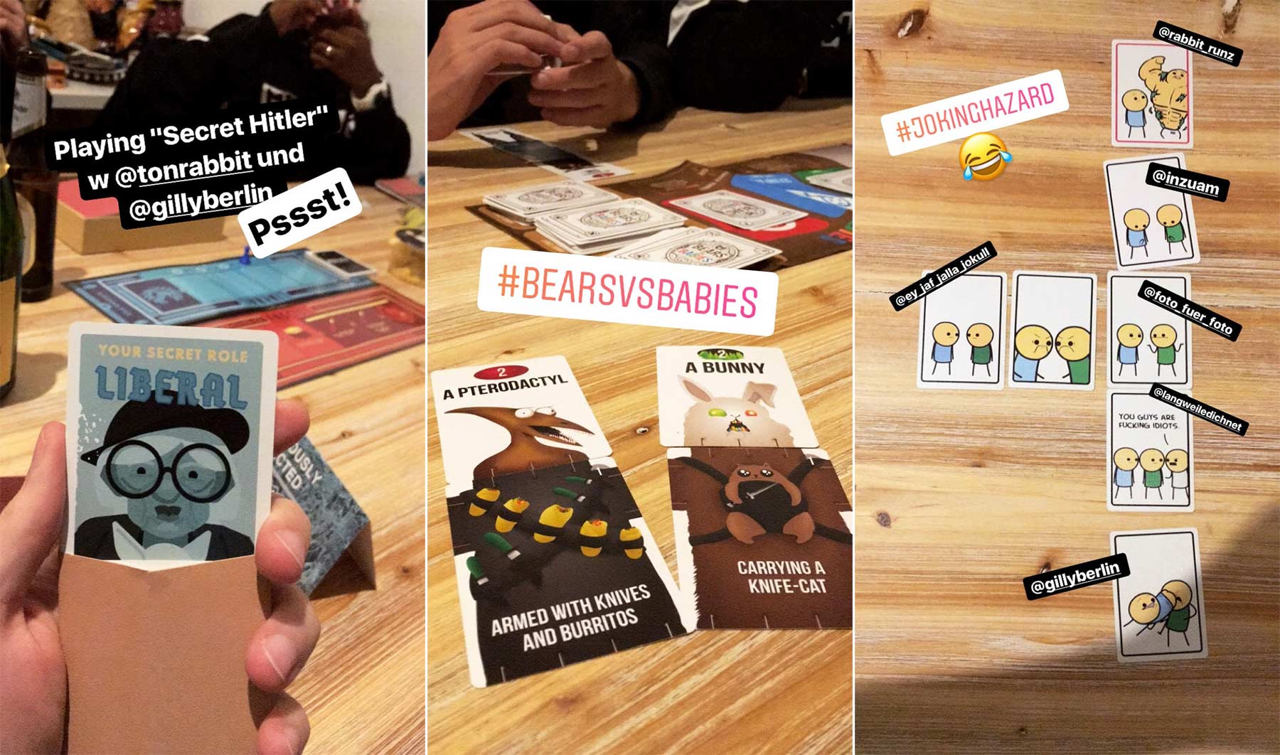 Am Wochenende wurde es entspannt-spaßig. Beim Spieleabend Samstag habe ich u.a. mit Shawty und Gilly ein paar Runden „Secret Hitler“ gespielt. Und „Bears vs. Babies“ (Partnerlink). Und „Joking Hazard“ (noch ein Partnerlink) von Cyanide & Hapiness. Alles drei noch immer verdammt gute Spiele, die ich euch ans Herz legen möchte (vor allem SH und JH!).