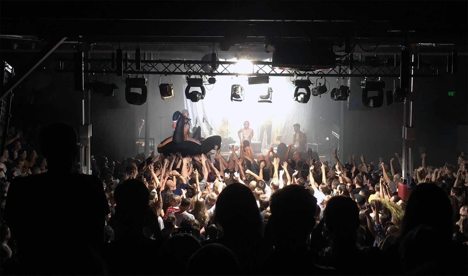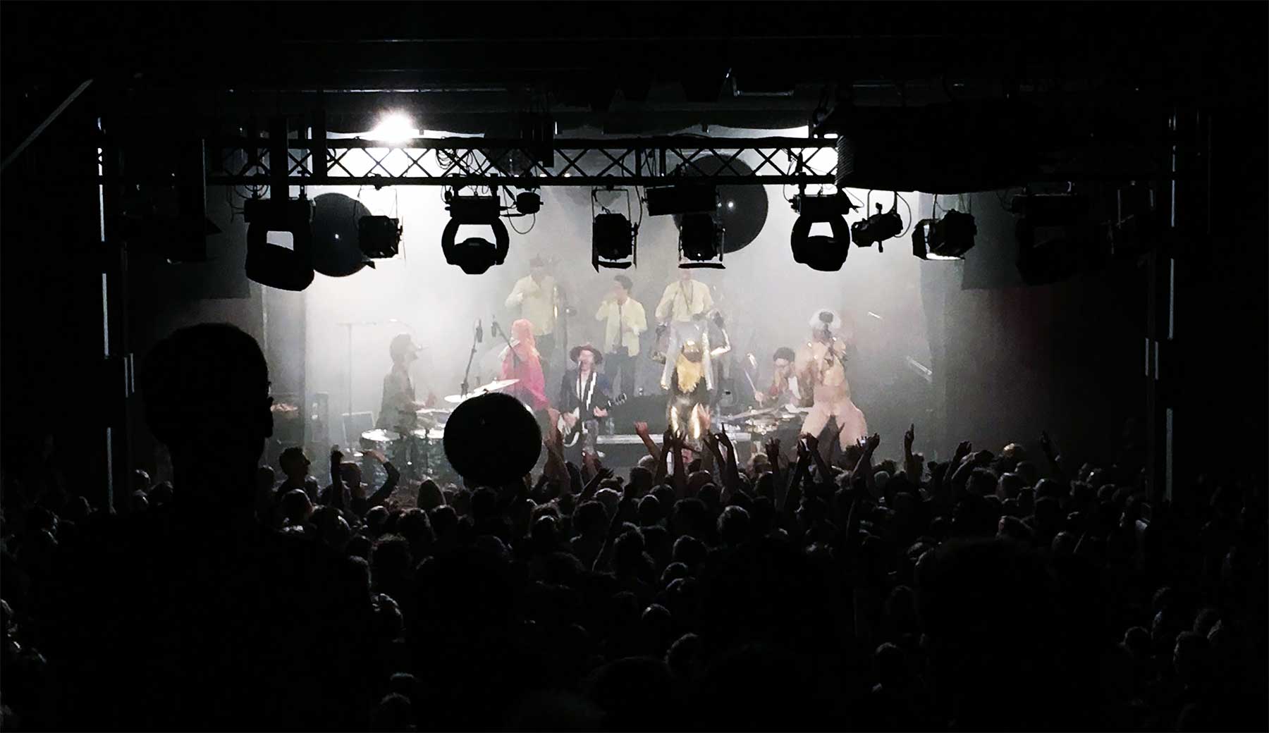 Deutlich besser wurde es musikalisch im Freitag. Okay, zunächst nicht, da zwei seltsame Voracts (unter anderem der spätere Band Drummer, der als „Big Fly The Mässive“ seltsamen Techno-Krams verzapft hat, der mit noch seltsameren Animations-WTF?!-Visuals harmoniert hat) uns die verkaterte Stimmung vergeigt hat, so dass wir uns doch lieber aufs heimische Sofa gewünscht hatten. Aber dann kamen „Bonaparte“ und haben die Bude gerockt. Leider doch unerfreulich kurz (ich hatte die Band schon etliche Male auf Festivals aber noch nie solo gesehen und war etwas ernüchtert ob der ~80 Minuten…), aber intensiv. Und das, obwohl wir für die Voracts ganz nach hinten auf eine Empore gegangen sind, wo es Stühle gab und dann aufgrund der Fülle der auverkauften Location nicht mehr wirklich nah an die Bühne kamen. Wurscht.