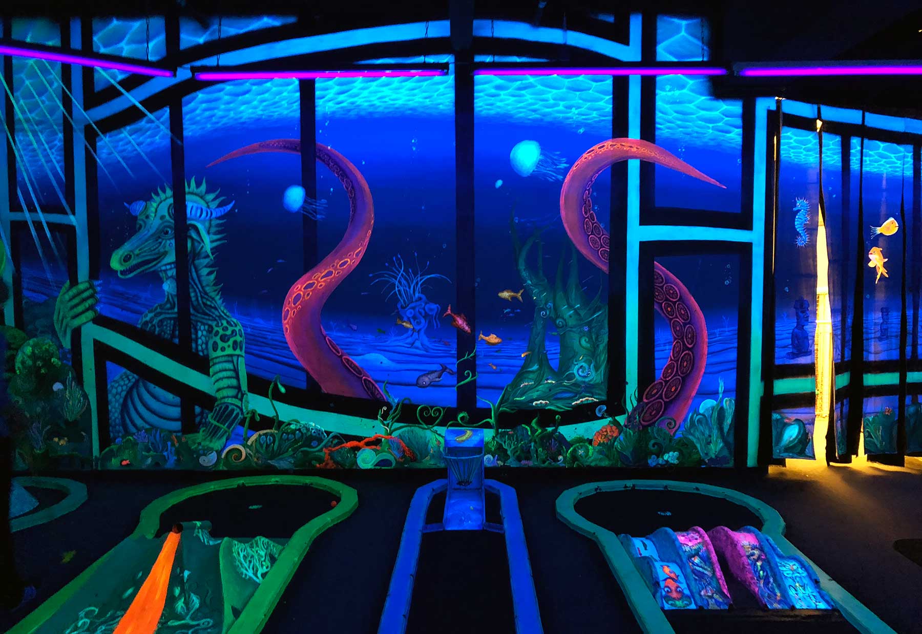 Zurück in der urbanen Umgebung haben wir Donnerstag eine Runde 3D-Schwarzlicht-Minigolf am Tempelhofer Hafenbecken gespielt. Glücklicherweise hatten wir den kältesten Tag der Woche erwischt, so waren in dem abgedunkelten und gefühlt luftdichten Raum nur gefühlte 35 Grad. Dass ich dieses hochsportliche Ereignis nicht unter den Teppich kehre liegt vermutlich daran, dass ich mit 56 benötigten Schlägen auf einem geteilten ersten Rang der familieninternen Wertung abschloss! Ich fürchte jedoch, so ein vielleicht Zehnjähriger, der nach uns dran war, war besser, aber [Ausrede hier einfügen]. So!