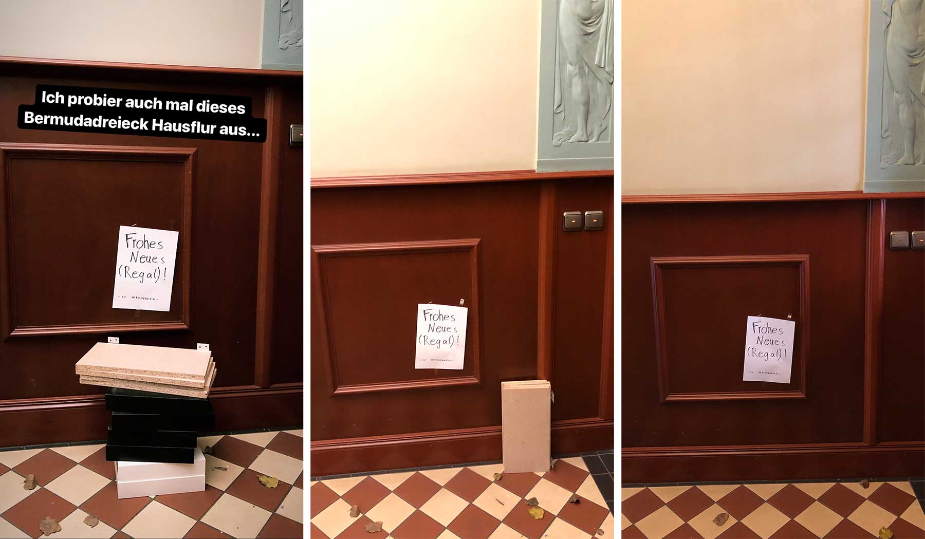 Bei Kranksein und Passiv-Kranksein schaut man auch viel Fernsehen und Krams, den man sonst vermutlich nicht sehen würde. Nein, nicht „Bachelor“, das schauen wir eh (Schande!), sondern Dokumentationen übers Aufräumen bei Netflix. Das hat dazu geführt, dass ich meine Socken und T-Shirts anders gefaltet und in den Schubladen verstaut habe (total spannender Content gerade hier, ich weiß…). Aber bereits vor der Doku-Induktion hatte mich das Sehrfrühjahrsputz-Gefühl gepackt und ich habe mich dazu entschlossen, endlich die letzten Überbleibsel vom Umzug loszuwerden. Beginnend mit ein paar Regalen, die ich auf den kurzen Hausweg loswerden wollte: