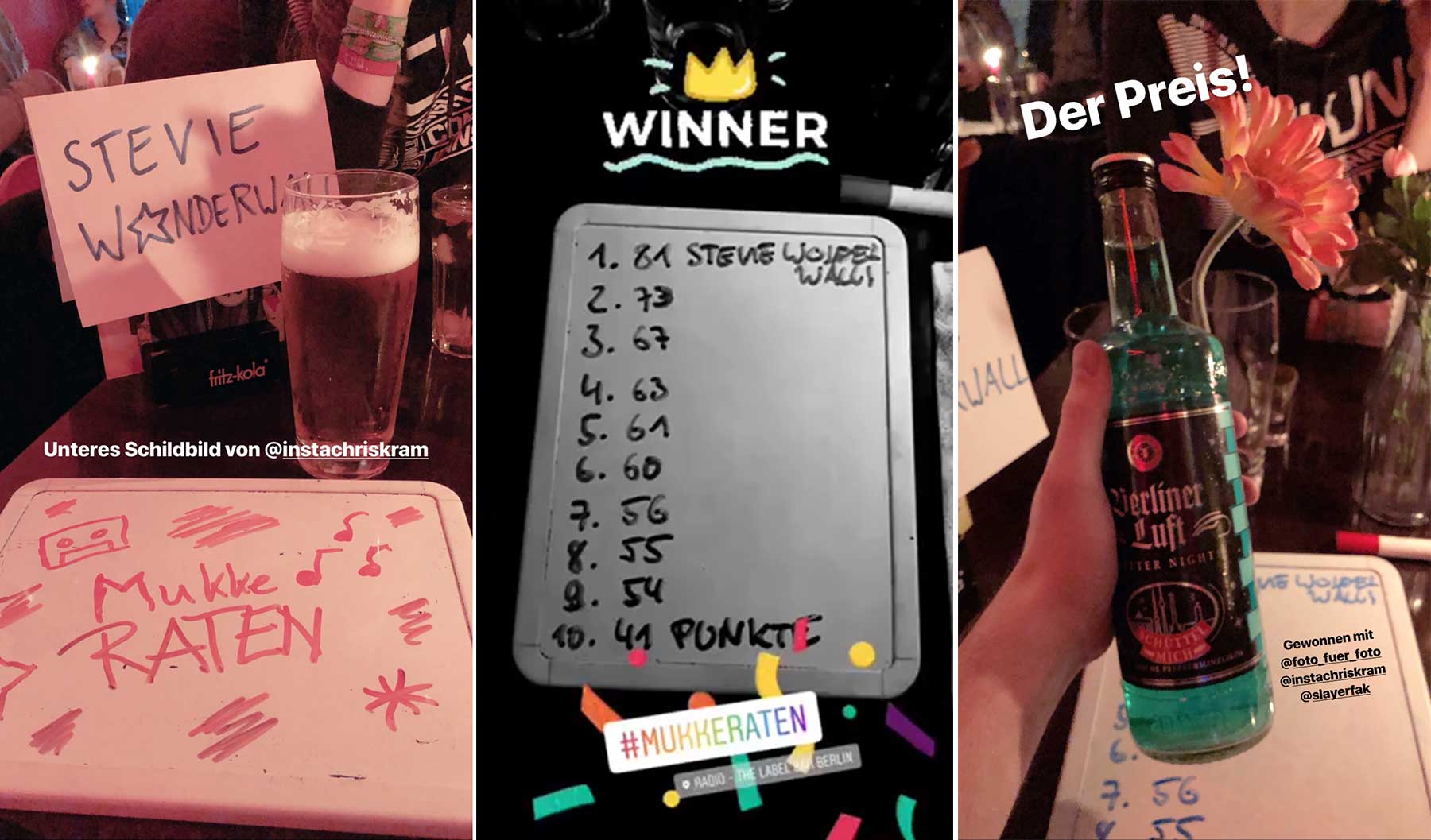So, genug mit Videospielen gelangweilt? Dann ab in das „reale“ Spiel. Donnerstag waren wir bei unserem monatürlichen „Mukkeraten“, bei dem leider zwei Stammkräfte aus unserem Team nicht mitmachen konnten. Entsprechend wenig motiviert waren wir ehrlich gesagt im Vorfeld. Aber zwei neue Gastspieler haben ausgeholfen und die Sensation vollbracht: Wir haben gewonnen! Und das, obwohl dieses Mal so viele Teams wie nie zuvor dort (10) mitgemacht haben. Vielleicht, weil sich das sonstige Dauergewinner-Team in zwei Sub-Teams aufgeteilt hat, vermutlich aber einfach, weil uns die Kategorien und Songauswahl entgegen kamen.