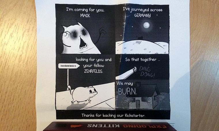 Bei meiner Rückkehr in Augsburg konnte ich mich über die Lieferung meiner Exploding Kittens-Exemplare freuen. Und auch wenn die crowdgefundeten Kartenspiele schon toll genug waren, war vor allem die Überraschung mit dem persönlichen Anschreiben sehr gelungen!