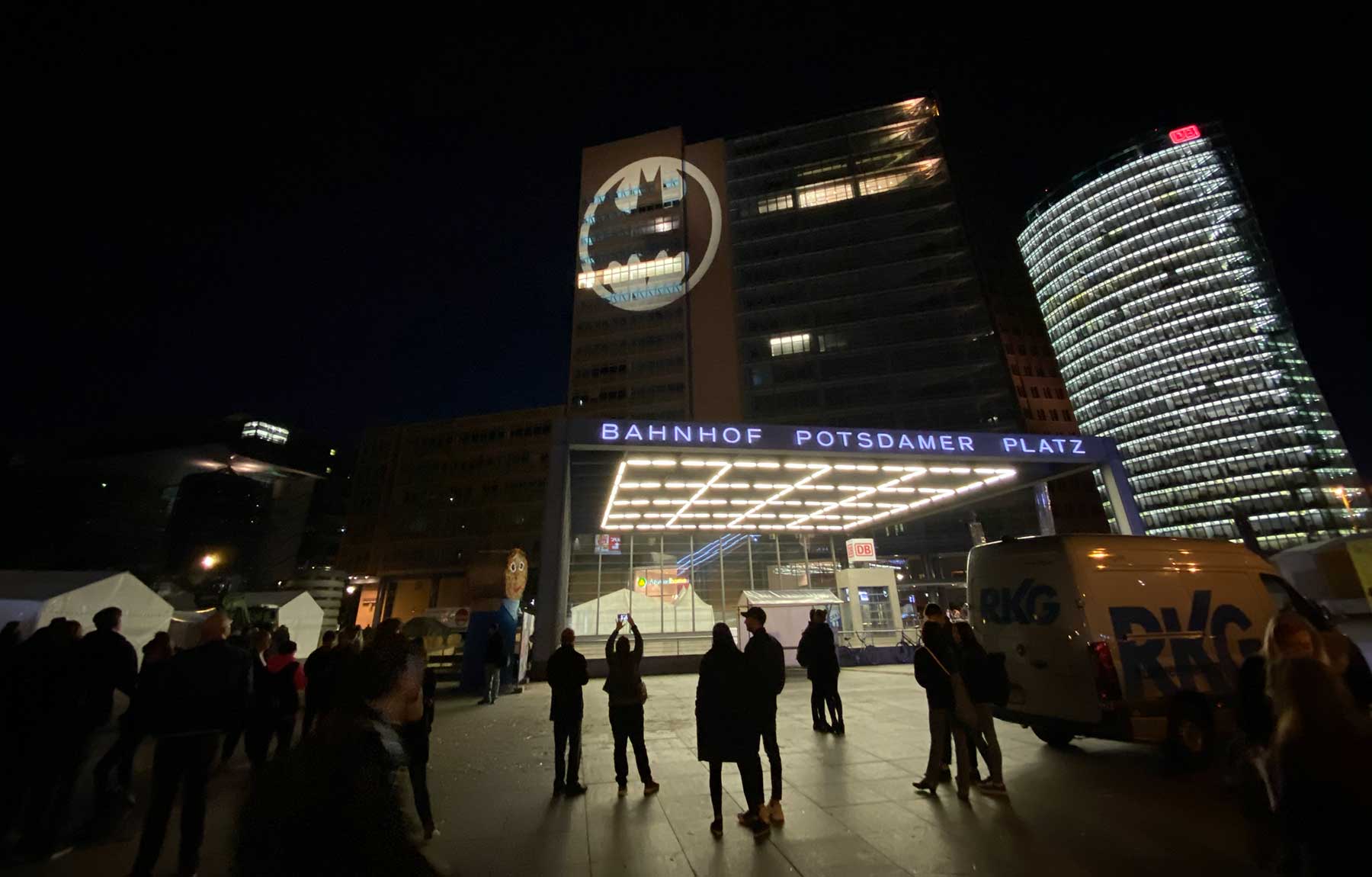 Eine erste Möglichkeit zur Nutzung bot sich Freitagabend am Potsdamer Platz, wo zu Ehren des 80. Geburtstages von Batman das Bat-Sign in die Luft gestrahlt wurde. Leider gab es keine Wolken (wenn man sie mal braucht, ey…), daher wurde das ikonische Symbol auf eine Hauswand projiziert. Dennoch ein ganz netter Moment, vor allem, weil einige Leute doch tatsächlich verkleidet zum „Event“ kamen.