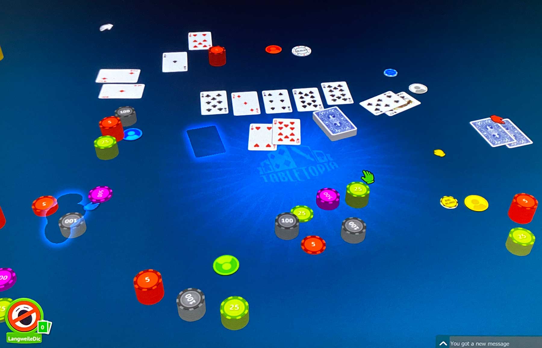 Unter anderem haben wir diese Woche mal wieder online eine Runde Poker gespielt. Nachdem wir zuletzt Tabletopia genutzt hatten, uns das aber insgesamt zu langsam und frickelig erschien (zumal man nicht einfach andere/mehr Chips erstellen kann), dachten wir an eine „echte“ Variante über einen der gängigen Clients. Unsere Auswahl fiel auf die „Home Games“ von PokerStars, aber das wollte so gar nicht funktionieren. Zum einen kann man den Zug-Timer nicht wirklich einstellen, der einen kaum Zeit zum Denken lässt (haben auch Unerfahrene am Tisch) und später hat sich das eh total verbuggt erscheinende Teil auch noch aufgehangen. Also wieder zu Tabletopia, etliche Zeit mit dem Aufbau verbracht, aber ein paar Runden gab es dann doch noch. Nachdem ich die erste (und einzige) Person war, die alles verzockt und sich nochmal „einkaufen“ musste (haben nicht um echtes Geld gespielt), konnte ich mit der allerletzten Hand tatsächlich drei(!) der insgesamt fünf Leute komplett aus dem Spiel nehmen mit einem Drilling. Yeah!