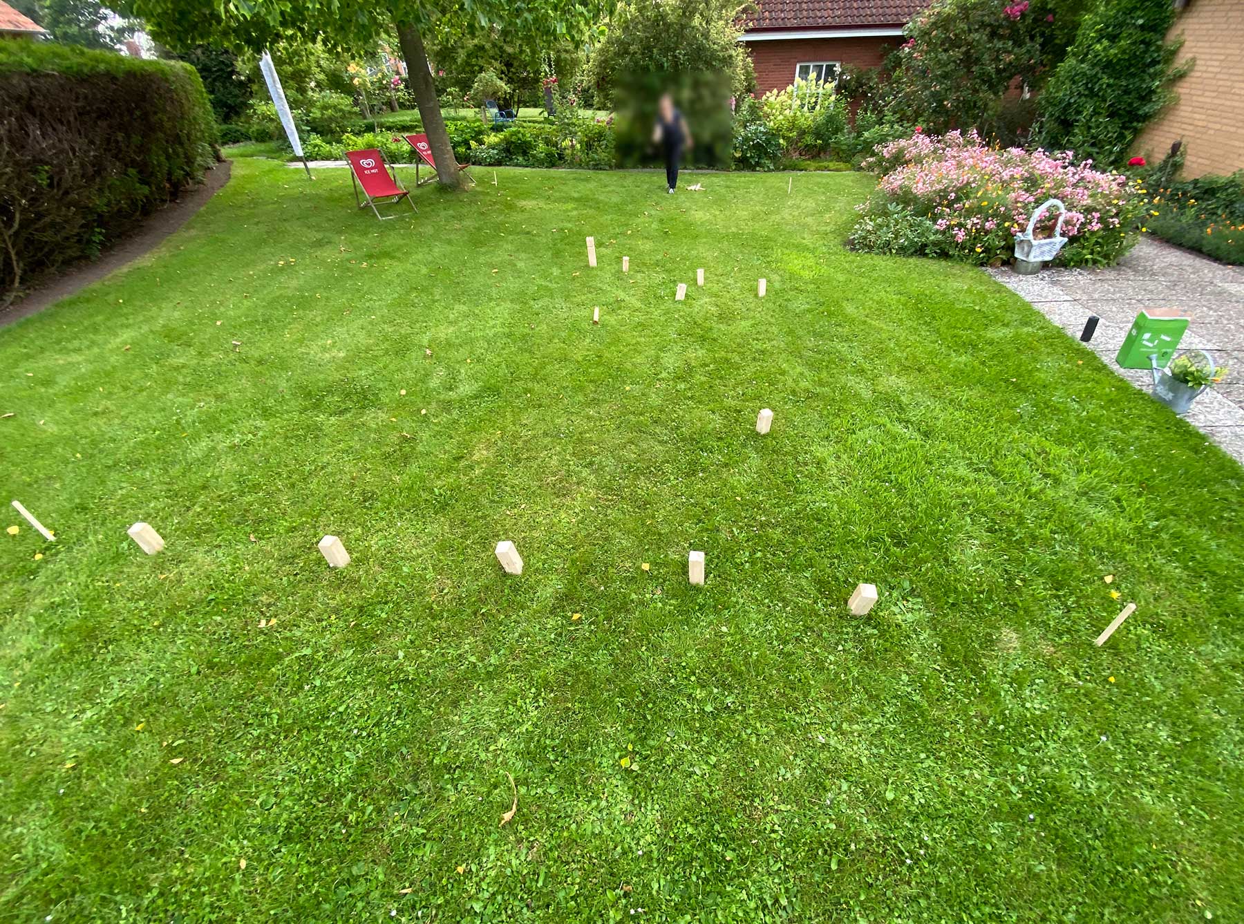 Ansonsten standen auch viele Spiele auf dem Programm. Neben Gesellschaftsspielen auch im „heimischen“ Garten. Nebst einer abenteuerlichen Frisbee-Rettungsaktion auch einige Runden Wikingerschach („Kubb“), was eh immer Spaß macht. Vor allem aber, wenn man selbst etwas Glück und die Gegenseite viel Pech hat, so dass es zu dieser mir noch nie zuvor vorgekommenen Spielsituation kam: