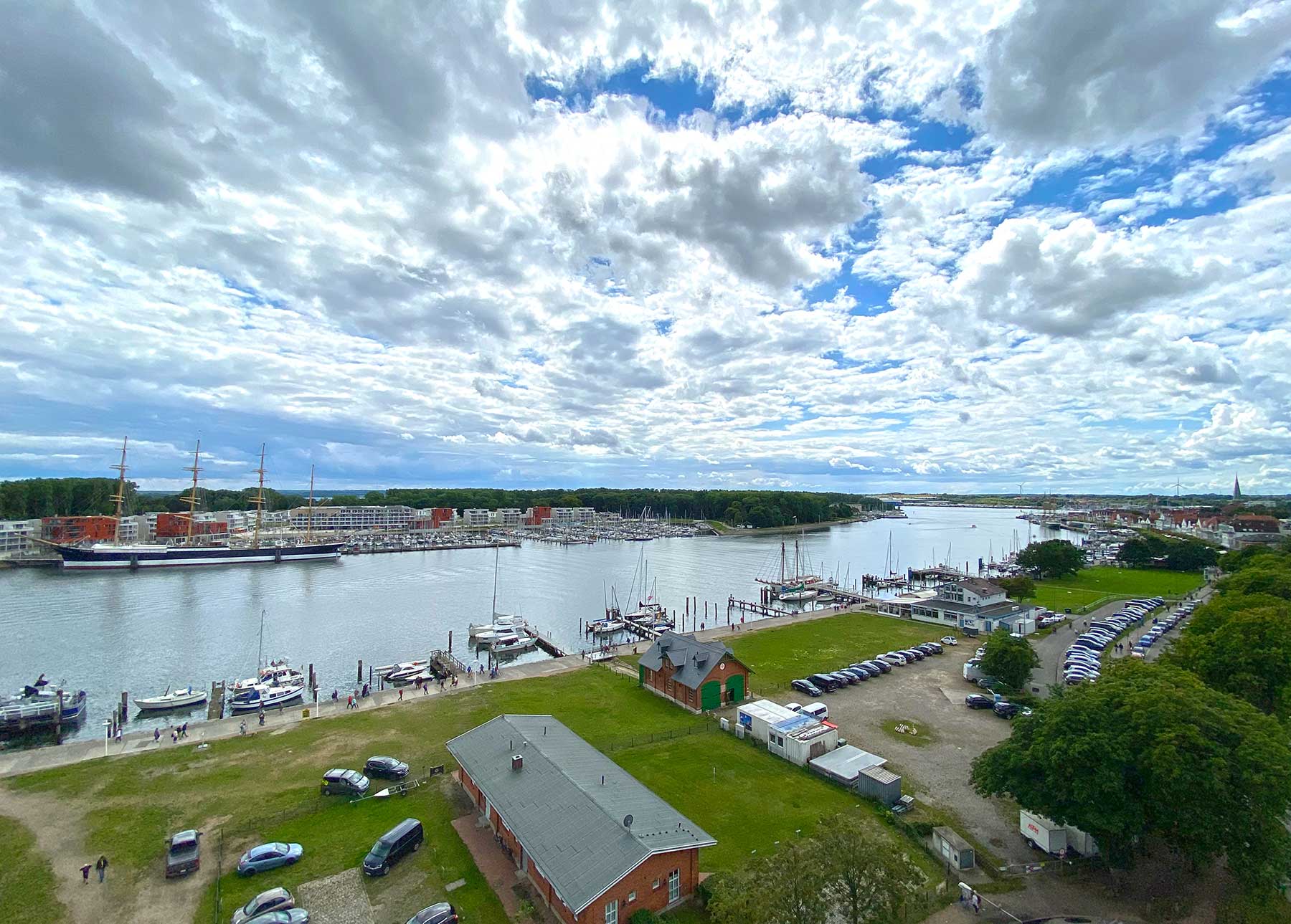 Dann waren wir noch auf dem ältesten Leuchturm Deutschlands in Travemünde, der nebst einigen kriegerischen Zerstörungen und Blitzeinschlag-begründeten Dachfeuern den sehr traurigen Geschichtseintrag besitzt, dass er Ende letzten Jahrhunderts endgültig gelöscht werden musste, da „Sichtversperrung durch Hochhaus“ vorlag. Scheiß Hotels! Dafür kann man da jetzt hochtapsen (maximal 15 Personen gleichzeitig) und den Ausblick genießen (etwas weniger mit Höhenangst…).