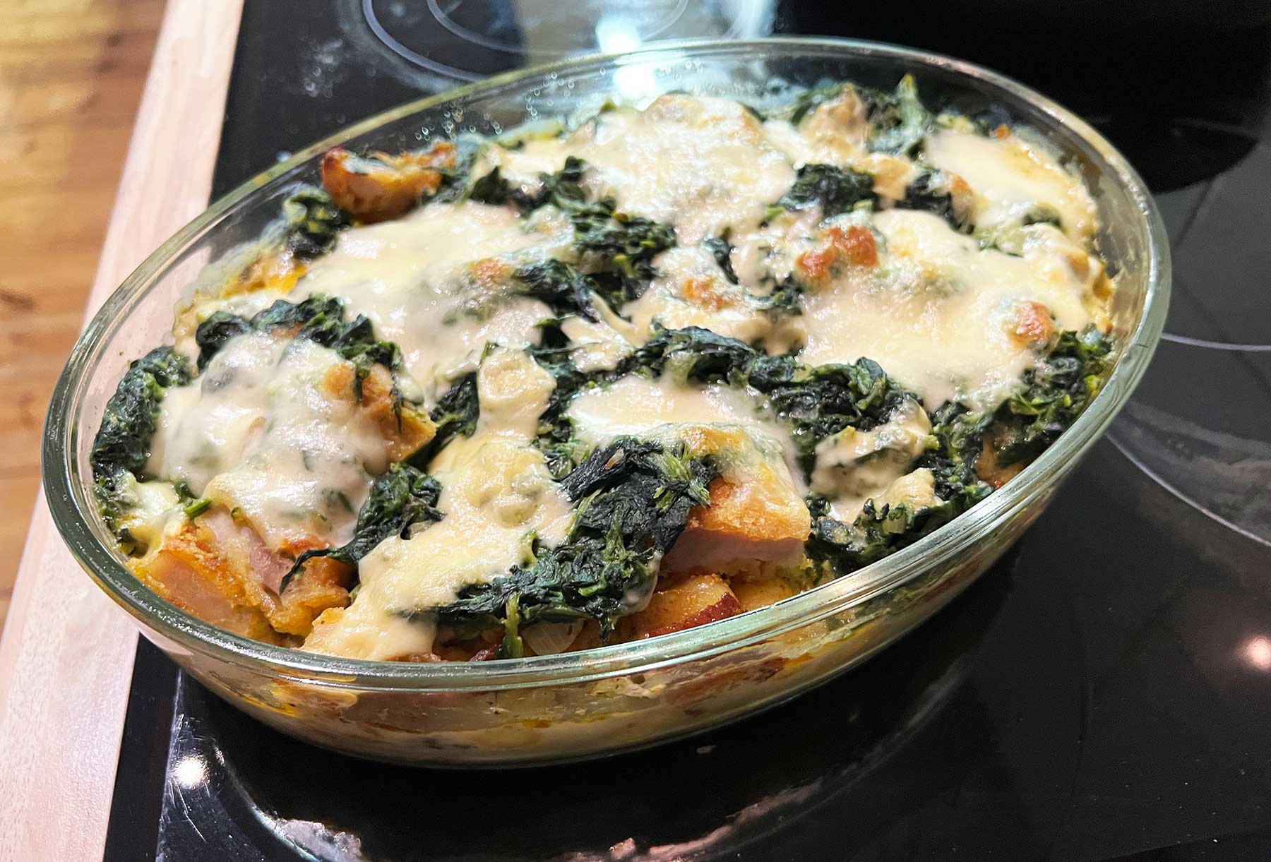 Sonntag war ich dann wieder mit Kochen dran und habe einen Gnocchi-Auflauf gemacht. Mini-Knödel- und Schnitzel-Reste vom Vortag inklusive, ähem…