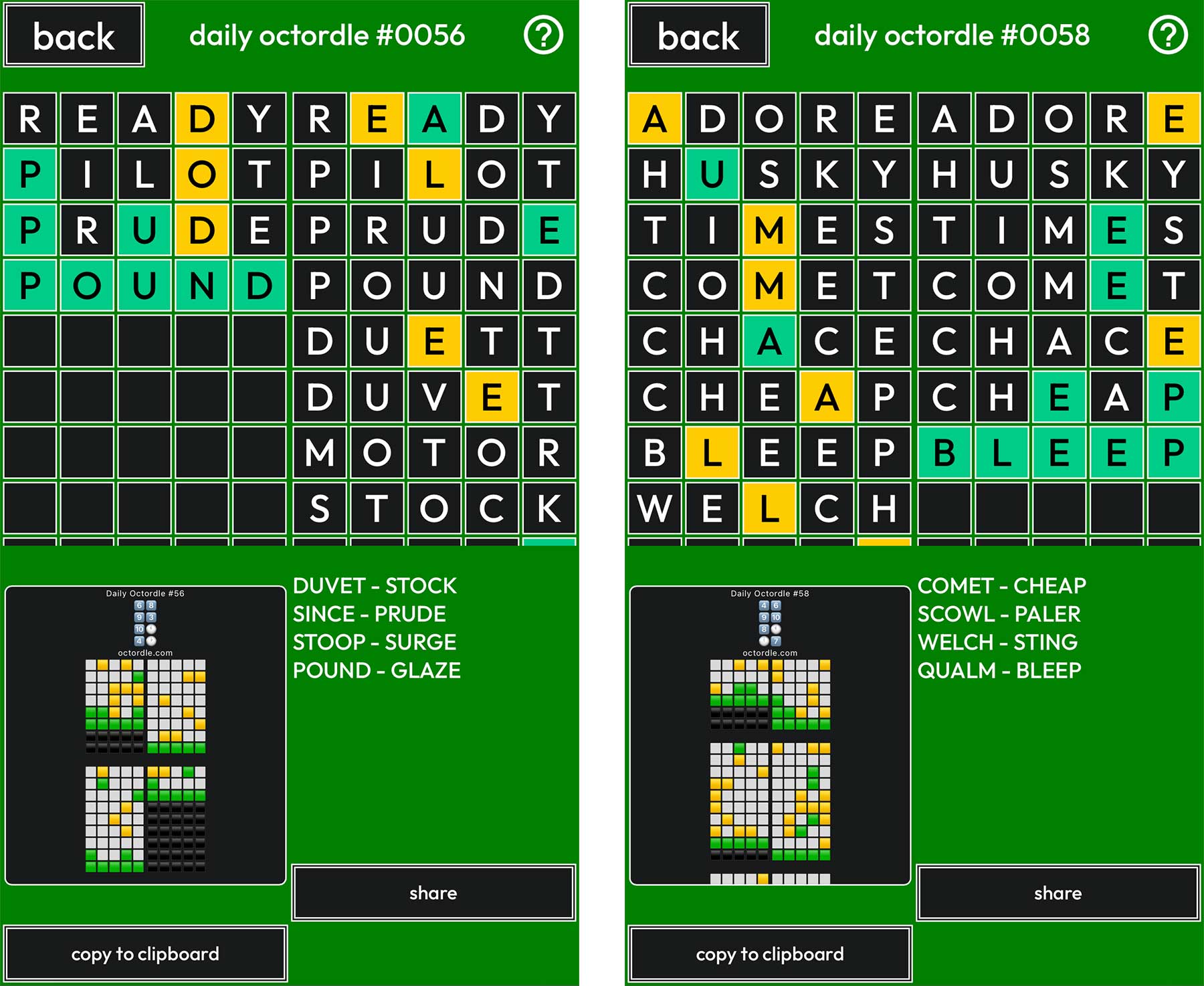 Aber hey, dafür hat mein Lieblingsmädchen das Octordle entdeckt, bei dem man acht(!) Wordles simultan lösen muss (gibt es auch als 2er- und 4er-Version) und ich habe ein paar geschafft!
