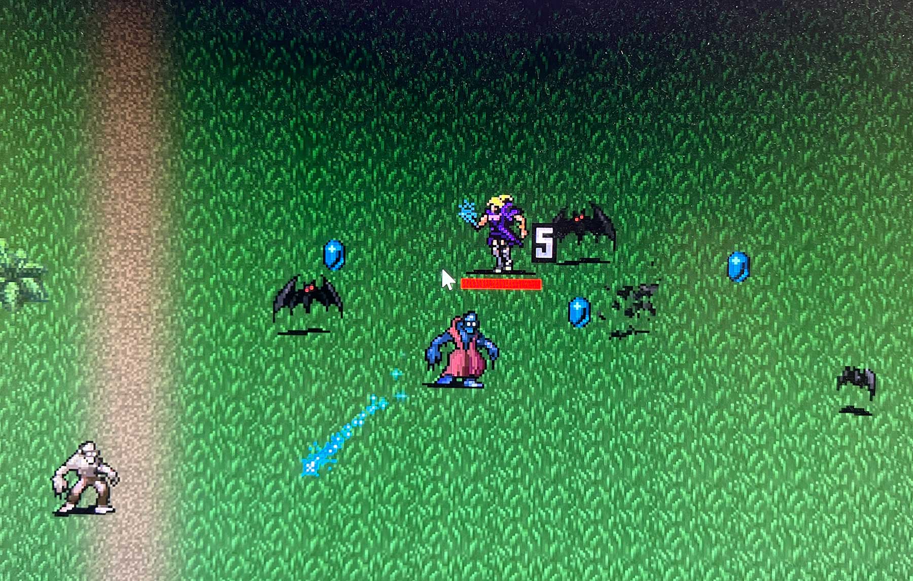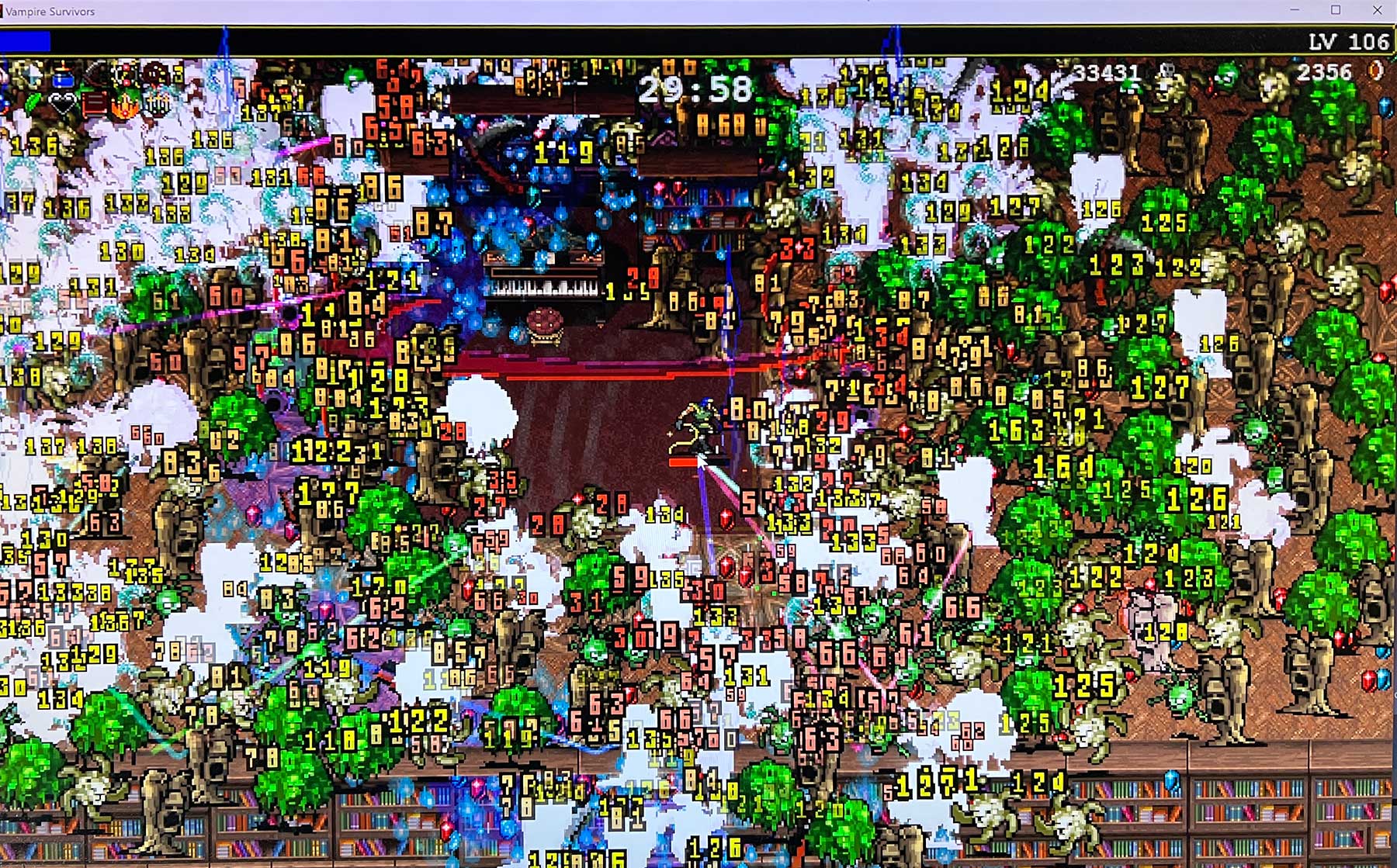 Nachdem Nils die Session beenden musste, bin ich dann doch mal seinem mehrfach geäußerten Spiele-Tipp gefolgt und habe „Vampire Survivor“ heruntergeladen. Gibt es für 2,39 Euro bei Steam und klang für mich erstmal zu rudimentär, steuert man doch eigentlich nur seinen Charakter, der automatisch auf sich nähernde Bösewichte schießt. Das Leveling-Prinzip motiviert aber, stetig noch eine Runde dran zu hängen. Naja, bis man dann „allmächtig“ erscheint und nach 30 Minuten automatisch der Stecker gezogen wird, um eine Runde zu beenden. Da bekommt man auf dem Bildschirm aber eh nicht mehr viel mit (s. zweiter Screenshot)…