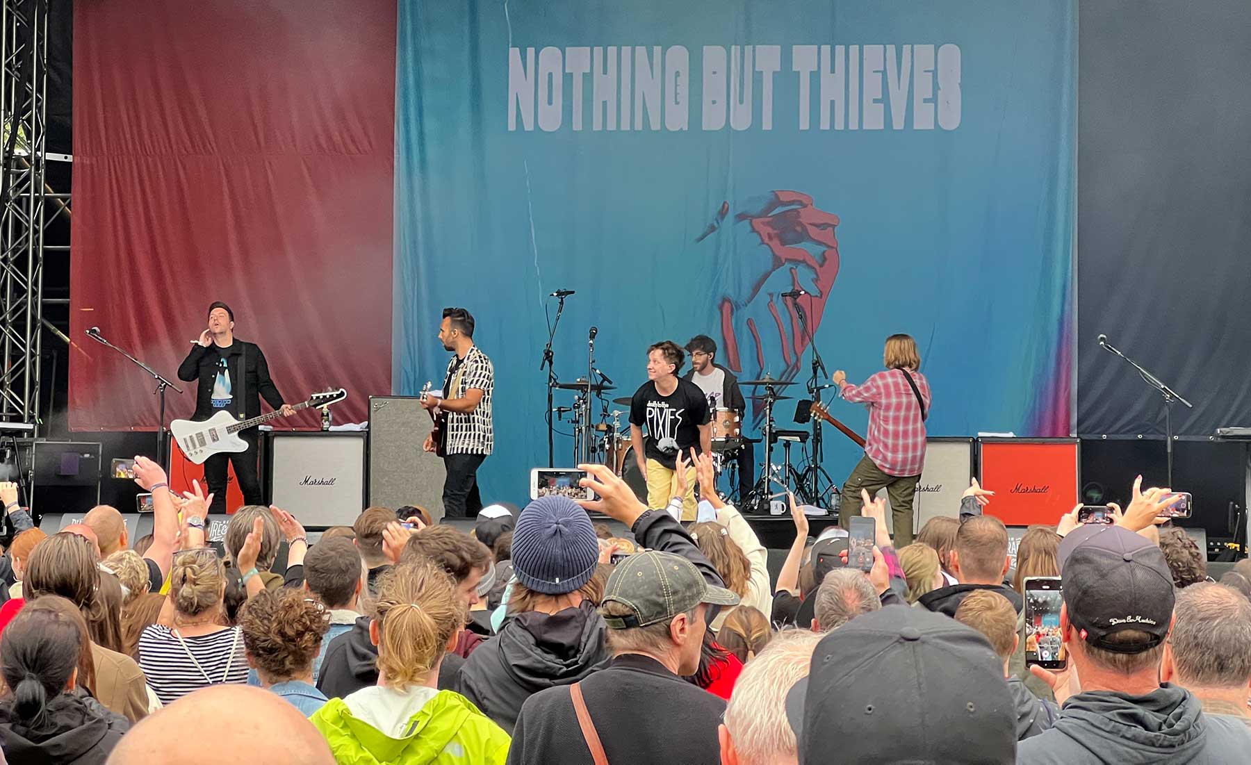 Die Wetterbedingungen sowie die Tatsache, dass der einzige Festivaltag auf einen Freitag gelegt wurde, hat dazu geführt, dass vor allem nachmittags kaum Leute vor Ort waren. Dass es selbst abends noch sehr Corona-freundlich zuging, dürfte jedoch auch daran gelegen haben, dass die Pixies kurzfristig absagen mussten. „Kurzfristig“ im Sinne von: Die Meldung, dass sie nicht können und der Timetable umgebaut werden müsse, kam in etwa als der erste Act mit dem Spielen begonnen hat… DER Headliner, der abschließend für 90 Minuten spielen sollte, und der natürlich auch für mich einer der Gründe war, Geld für ein Ticket auszugeben. Zentral ausschlaggebend waren jedoch Nothing But Thieves, die glücklicherweise wie geplant aufgetreten waren – inklusive Sänger im „Pixies“-Shirt und mit einem „Where is my mind?“-Cover!