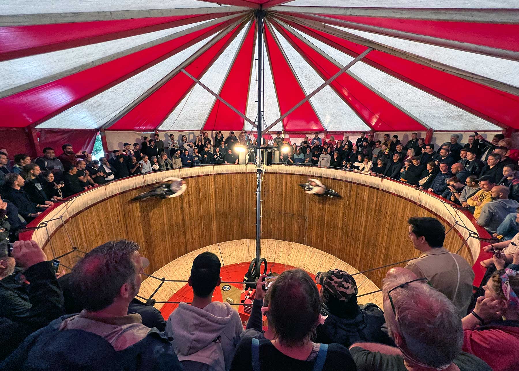 Im Ticketpreis inbegriffen (bis auf eine optionale Spende) war auch der Zutritt zum sogenannten „Motodrom“, wo Motorradfahrer in einem hölzernen Kessel gefahren sind – kurze Zeit sogar zu dritt übereinander! Absoluter Wahnsinn, das mal aus nächster Nähe zu sehen zu bekommen. Zu sehen gab es zudem auch noch Kurzfilme mit Motorrad-Bezug vom Lisbon Film Festival, angenehme Abwechslung mit ein paar kreativen Momenten.