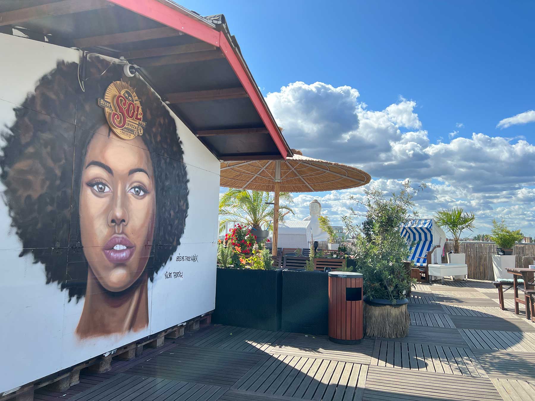 Nach über fünf Jahren haben wir endlich mal daran gedacht, dem Deck 5, „Berlins höchster Strandbar“, einen Besuch abzustatten. Drinks sind schon sehr teuer, aber die haben Strandkörbe und ein charmantes Mural, an dem „Nicht fertig!“ steht.