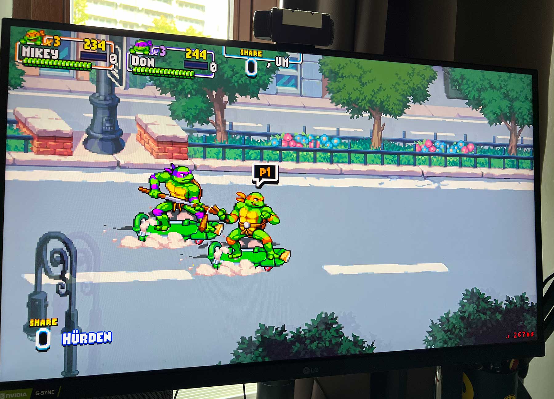 Aber erstmal zurück zum letzten Wochenende – da habe ich nämlich eine launige Runde „Teenage Mutant Ninja Turtles: Shredder’s Revenge“ mit Nils gezockt. Kann man mal machen! Sehr (zumindest visuell) abwechslungsreiche Koop-Action im Retro-Pixel-Gewandt, das auch ordentlich Mehrspielwert haben dürfte, auch wenn 25 Euro schon ein happiger Preis sind (hatte da eher 12-15 gehofft…). Zu zweit ist aber bereits ordentlich Chaos auf dem Bildschirm!