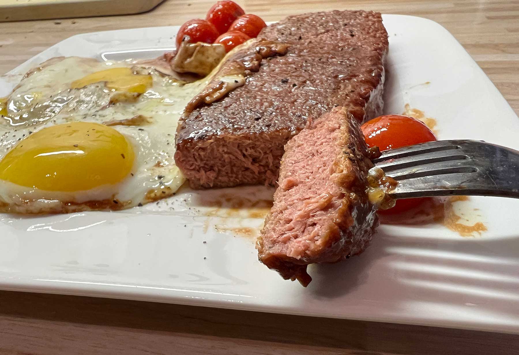 Nicht super aber doch erstaunlich gut fand ich ein veganes Steak, das ich mal testweise im Supermarkt gekauft hatte. Vor allem war ich überrascht, welch chemischer Prozess dazu geführt hat, dass die beim Herausnehmen aus der Packung eher wie ein loser Brei wirkende Masse nach dem Anbraten eine gewisse Festigkeit hat annehmen können. Und dann kam da noch Rote-Beete-Saft als Flüssigkeit raus, was etwas seltsam anmutete. Aber das schaut auf dem Bild auch strukturell schon ziemlich nach Fleisch aus! Der Geschmack war jetzt nicht ganz par zu einem guten Steak, aber es hat (anders) gut geschmeckt.