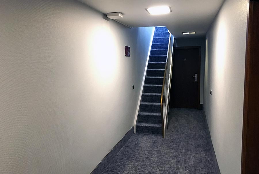 Zunächst ging es jedoch ins Hotel. Bei der Begrüßung hatte ich mich bereits gewundert, dass es „mit dem Fahrstuhl in den Fünften und dann die Treppe hoch“ hieß. Na gut, nachträglicher Zubau halt. Die dann etwas versteckte Treppe hatte aber schon etwas von Horrorfilm. Auf der Dach-Etage gab es genau zwei Räume – oder besser Suiten. Sehr verwinkelt, aber dafür groß gebaut, Klo getrennt von dem Bad, da man aufgrund des Platzes kreativ werden musste. Nicht ganz meins, aber besonders.