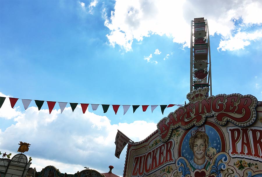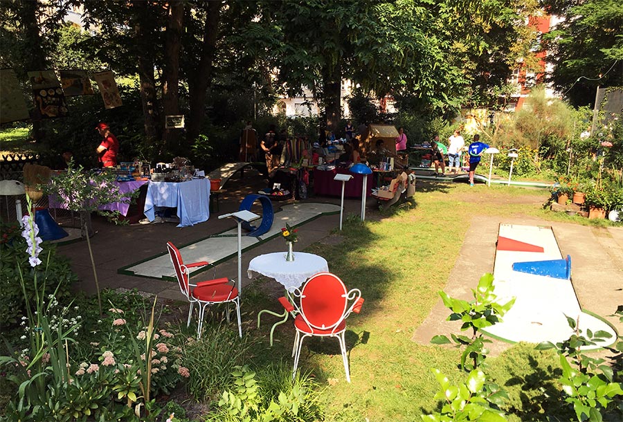Am Samstag haben wir dann durch Zufall (Flyer beim Restaurant „Ungeheuer“, das für das geniale Frühstück oben verantwortlich ist!) einen Minigolf-Flohmarkt gefunden. Oder ein Flomarkt-Minigolf. Jedenfalls gab es zwischen und neben den Bahnen kleine Tischchen mit Klamotten während andere ganz normal gespielt haben. Tolle Idee! Und wir haben für zwei Euronen ein Nichtlustig-Würfelspiel erstanden – strike!