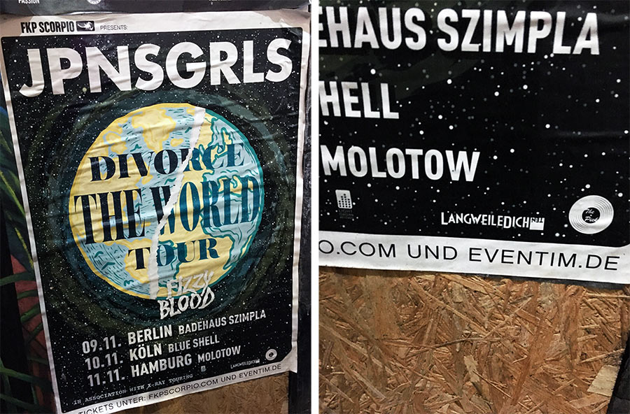 Noch vernünftiger war das Plakat-Logo übrigens bei den JPNSGRLS, denn dort prangte bereits das neue LwDn-Design auf den visuellen Werbebotschaften. Das erste Mal war ich im neuen Molotow und noch nie habe ich ein so spät beginnendes Konzert besucht. Kurzfristig wurde der Beginn der Veranstaltung nach hinten verschoben, so dass die Band erst um 1 Uhr angesetzt war. Mit Martin habe ich „jugendlich“ gespielt und tatsächlich durchgehalten. Leider war es dann aber doch zu spät (bzw. der Frühstückstermin am nächsten Morgen zu früh), um noch etwas mit der Band abzuhängen und zu quatschen. Next time!