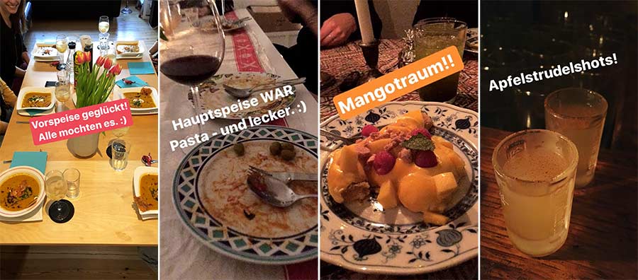 Danach folgte eine zwar unspektakuläre aber sehr leckere Pasta, die mit kuriosen Gepsprächen über Airbnb-Angestelltendasein und Sexualkunde-Unterricht für Drittklässler angereichert wurde. Ach ja, und Alkohol. Ich wundere mich schon ein bisschen (sehr), dass ich heute trotz heiterem Durcheinandertrinkens gestern ganz okay drauf bin… Zur Nachspeise gab es dann Mango-Sahne-Mascarpone-Kalorienbombe auf Löffelbiscuit – sehr lecker. Und reichhaltig. Und dank Himbeer-Beilage super gesund. Oder so. Vielleicht meinte ich damit aber auch die Gurke im selbstgemixten Moscow Mule… Kurioserweise hatten die Gastgeber neben den beiden teilnehmenden Zweier-Pärchen plötzlich auch noch Cousinen und Freunde eingeladen, was ich etwas unangebracht und schade (weil den Sinn des Abends verfehlend) fand, aber was will man machen. Lustig war es dennoch.