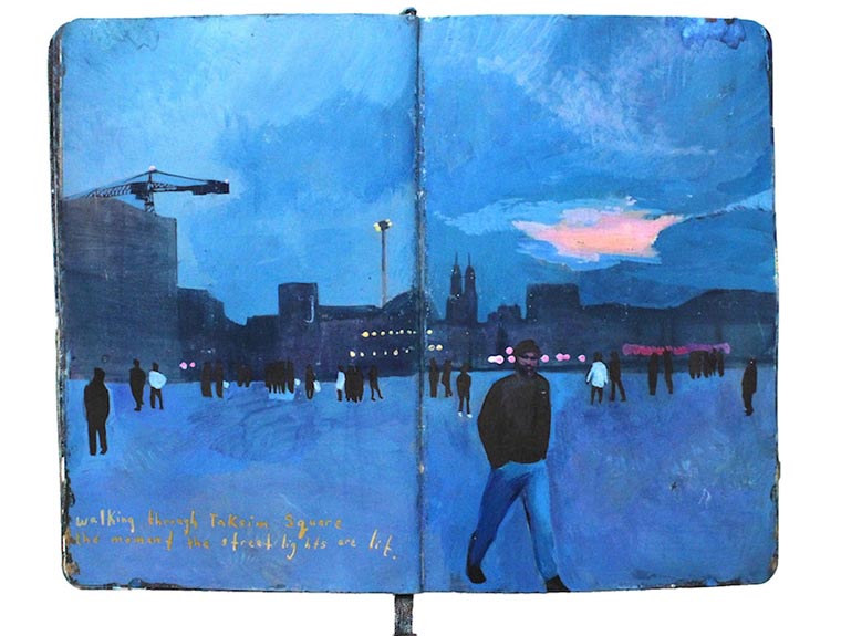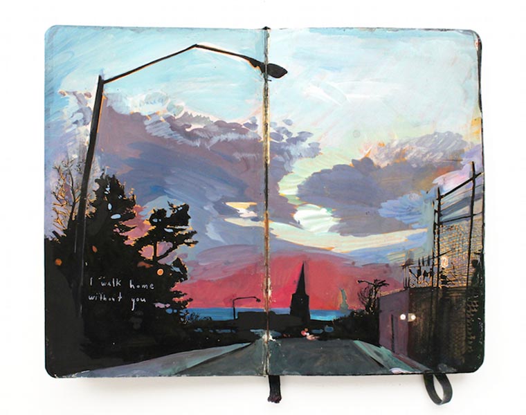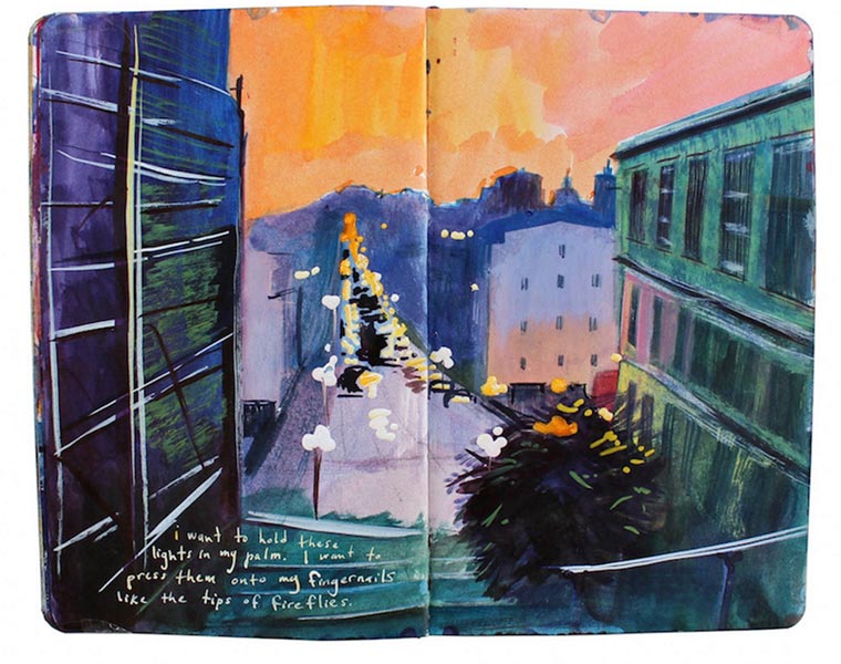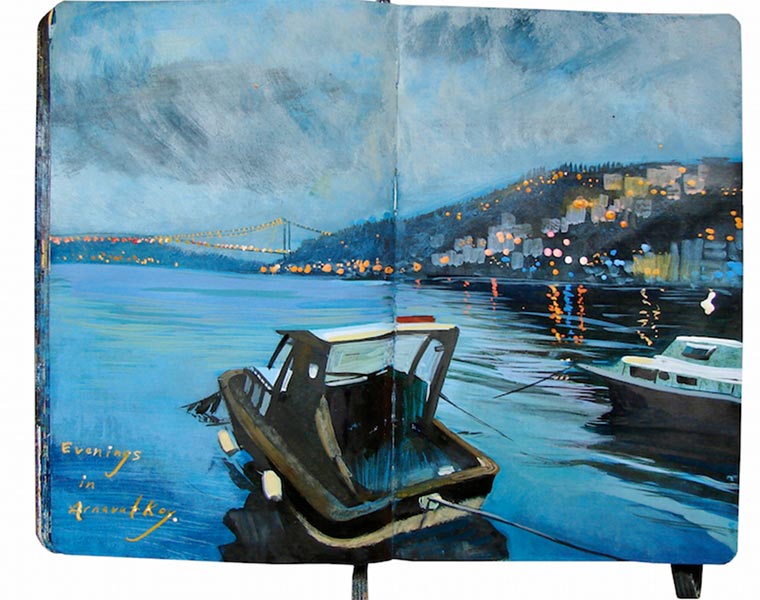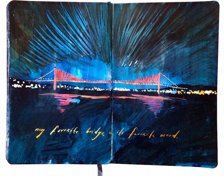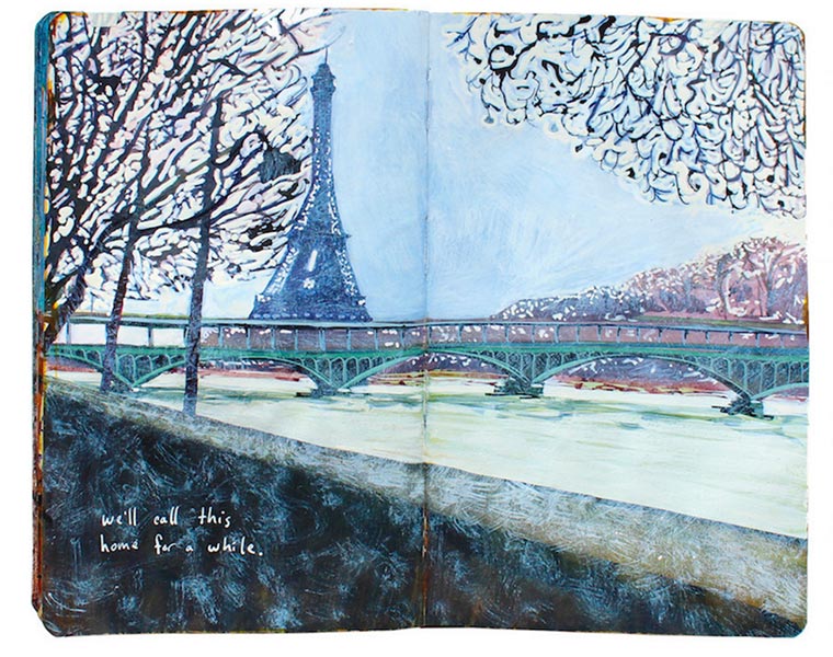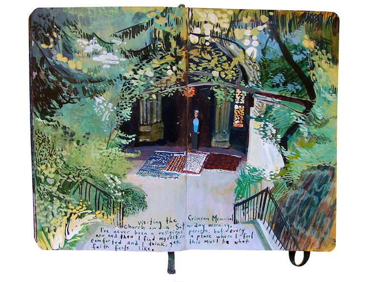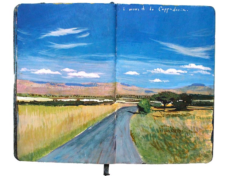 „For nine years I have painted in Moleskine journals with acrylic ink. Each page is a painting of a landscape or memory embellished with handwritten descriptions. I combined my two most recent journals into one book entitled Standing in Asia, Looking at Europe, Thinking of New York.“