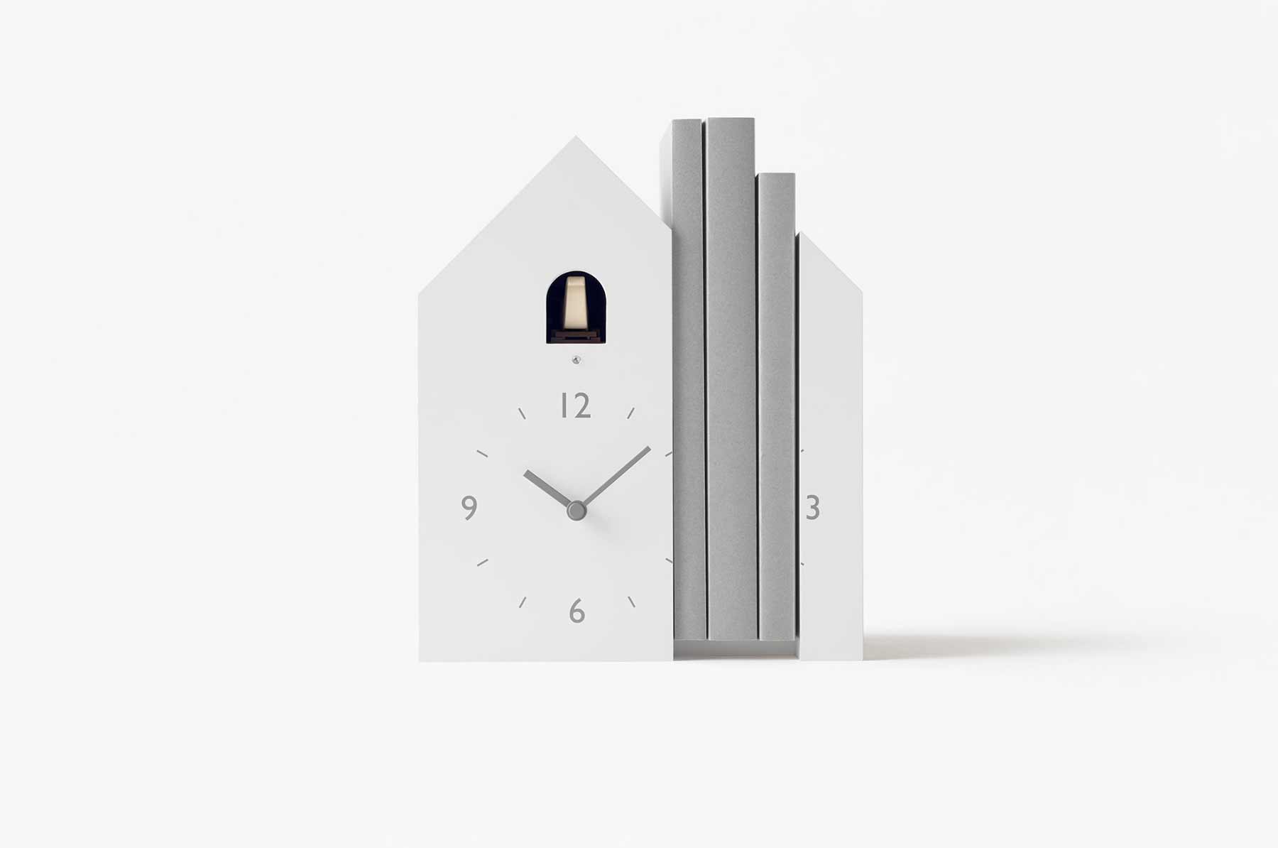 „A cuckoo clock that can be used as a bookend by splitting the dial’s face into two parts. This merge comes naturally as the clock and books co-exist on the shelf harmoniously together.“