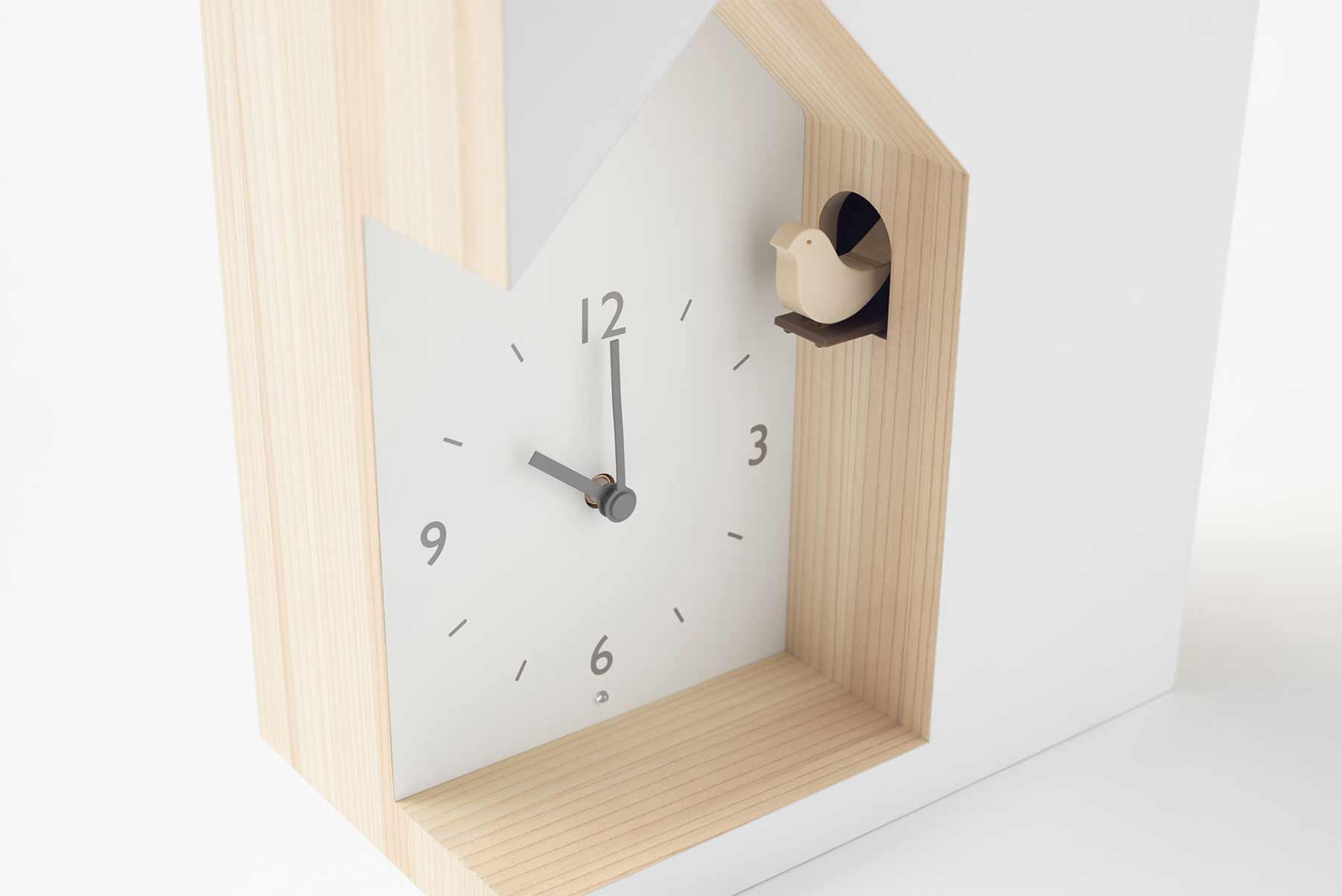 „The unusual angles of both the cuckoo bird and the dial design imply that this clock should be placed upside-down. Placing the heavier internal components asymmetrically on one side of the base enables the clock to naturally maintain its balance.“