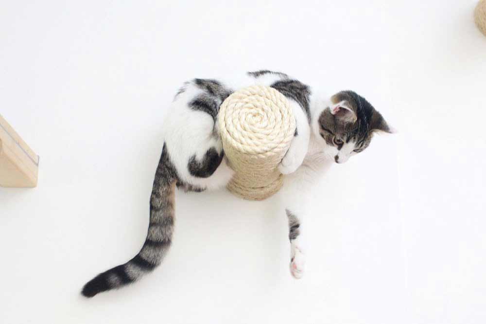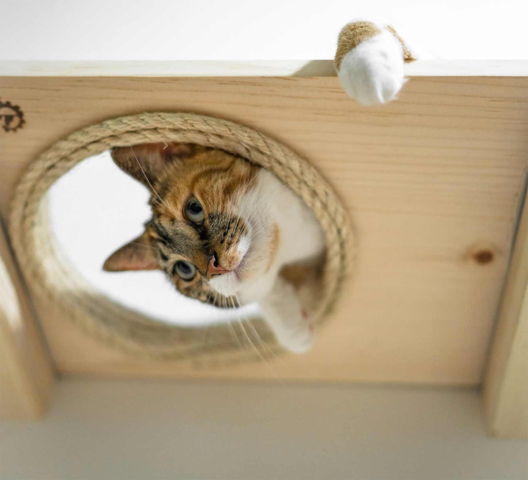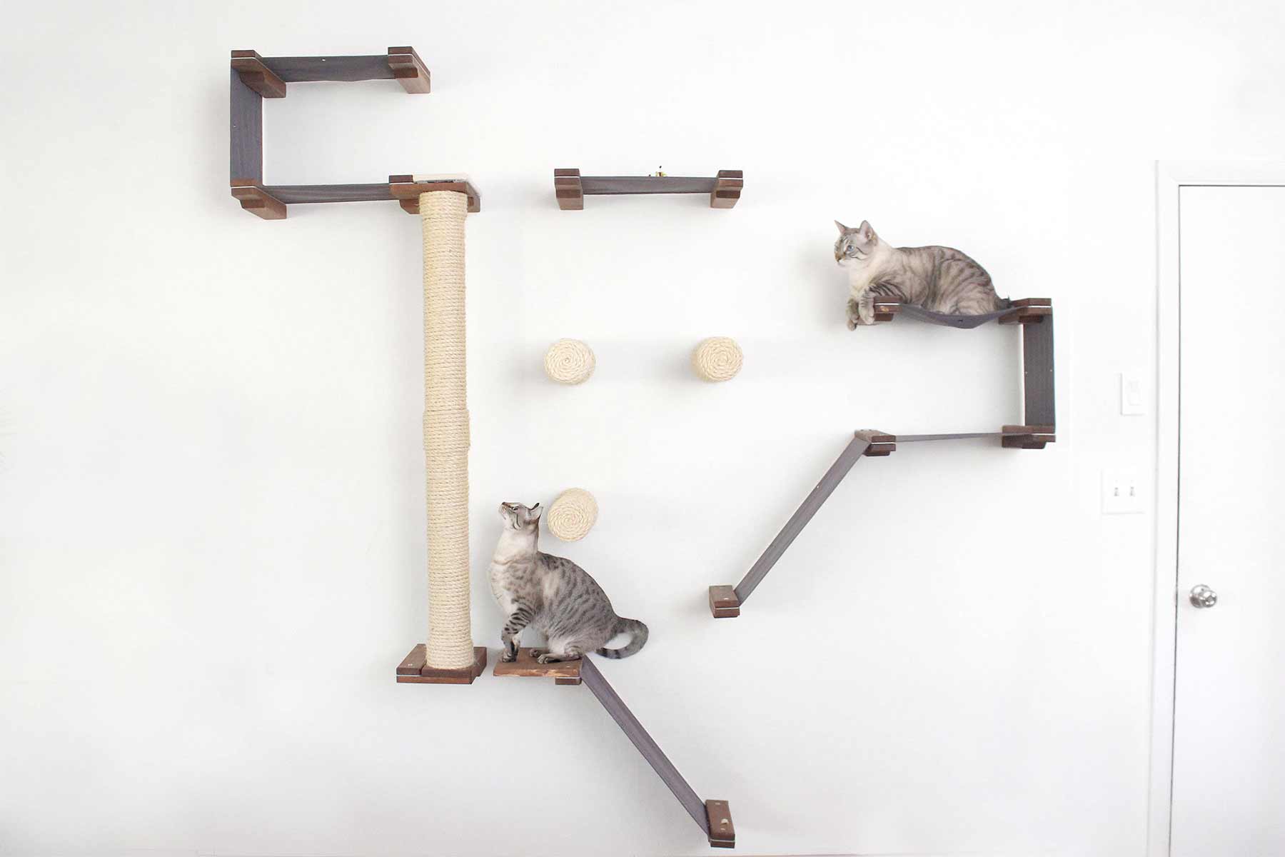 Katzen machen ja ganz gerne mal menschliche Wohnungen zum Spiel- und Tollplatz, da macht es natürlich Sinn, ein paar speziell dafür gedachte Dinge anzuschaffen. Doch nehmen Kratz- und Kletterlandschaften oftmals raren Platz ein. Eine originelle Alternative liefert dieses smarte System, das man einfach an der Wand abringen kann. Ein bisschen Deko, aber vor allem richtig viel Abenteuer-Spielplatz für die Vierbeiner.