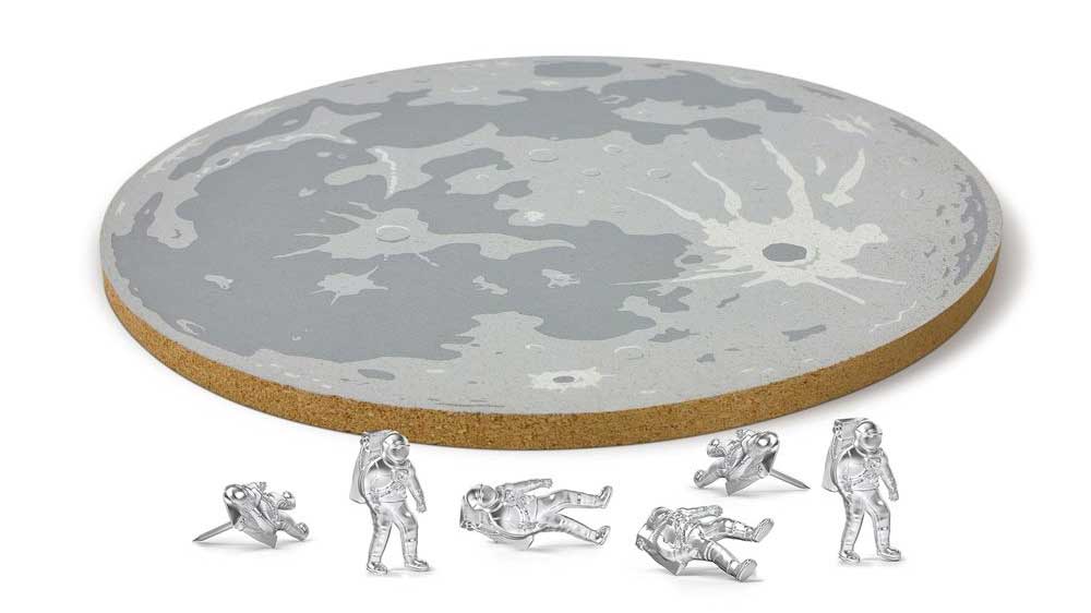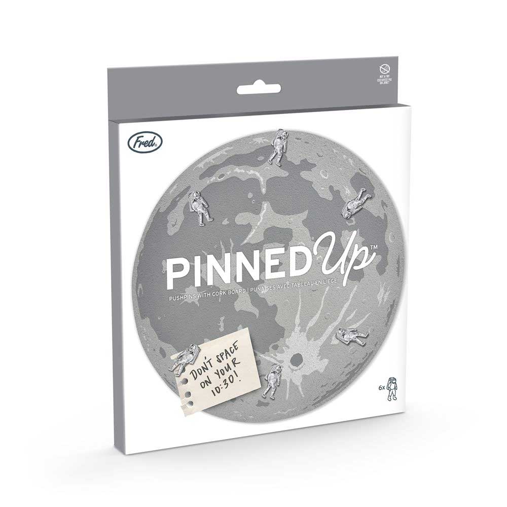 „If your desk is beginning to feel like a black hole for important papers, PINNED UP will help you get organized and make your workspace out of this world! Fred’s full moon corkboard and astronaut push pin set are perfect for all of your notes, photos, and doodles! The moon measures 7″ in diameter and comes with 6 silver astronaut push pins. Packed in a colorful, peggable display box.“